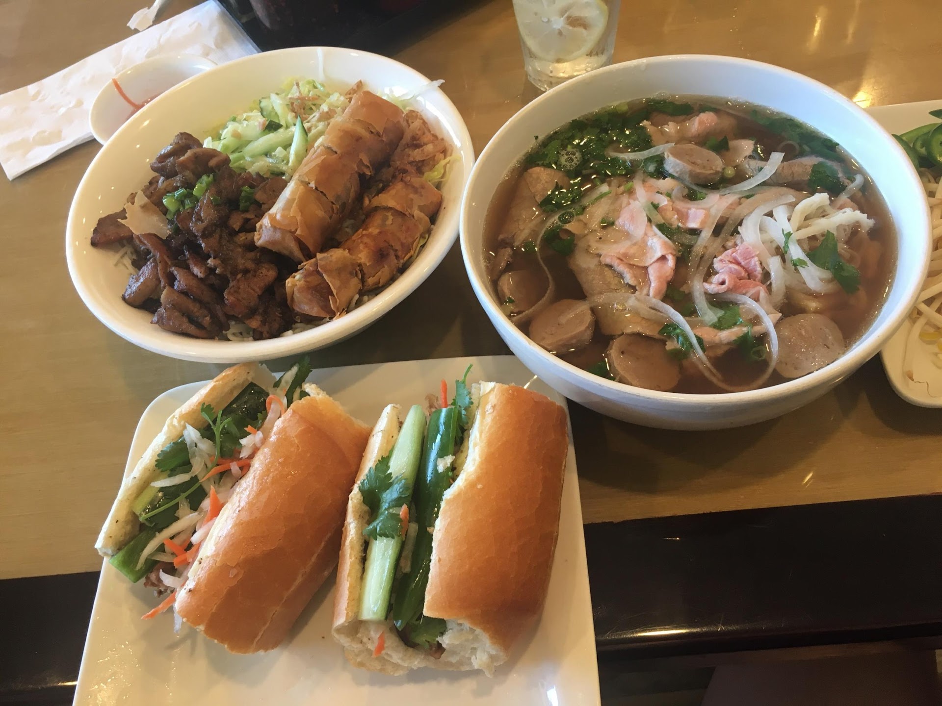 The vermicelli salad was good, the ingredients fresh, a heaping of grilled pork and 2 eggrolls! My only gripe was the amount of sauce i got with this huge bowl of noodles, veggies, and meats was too small, it made the flavor taste mostly of noodles. After adding a half sauce bowl, the whole dish came together and it was phenomenal. 9/10 for flavor and a big portion! Come for this dish the b27? Grilled pork and eggrolls. The eggrolls had jicama in it which I myself are not a fan of but my wife loved them.