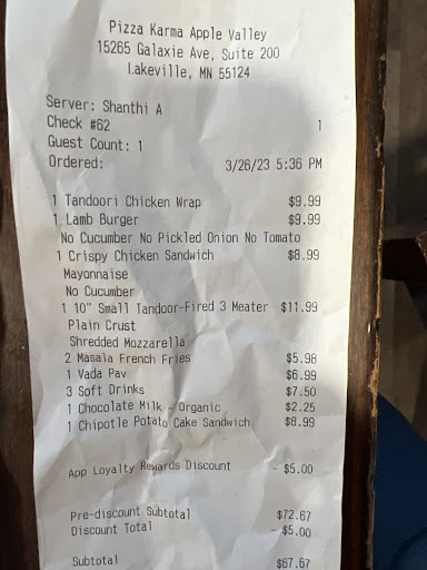 Read moreI know this place is new so I’m giving them grace here. Our family of 6 went to try this for dinner. Out receipt printed at 5:36pm. It was a big order so we didn’t except super fast service. The pizza came out within 15 min, the masala fries (so good) about 10min after that. Three groups came in after us and all got their food before us. In fact, one couple next to us got brought a sandwich and opened it and declared it wasn’t his so they took it back. (We believe that was our lamb burger we received 15 min later, cold.) It was 6:10 when I received my tandoori wrap (it was delicious) another five min went by and my daughter got the Vada Pav which the waiter said was the chicken sandwich. 🤷♀️ Then the cold lamb burger for my son came out and all we were waiting for was my daughters potato cake sandwich. The waiter asked if that was finally everything and we said no, we still needed one more, and 10 min later the potato cake appetizer appeared. I explained that it was wrong, that we ordered the sandwich and even showed him the receipt. He responded that they do not have a potato cake sandwich. 🤔 So, although we did get, mostly, what we ordered, it came out over the course of 50 minutes. So they really need to figure that out.
