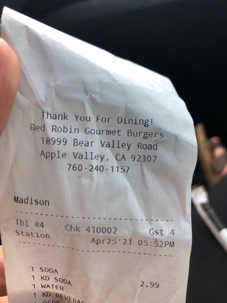 Read moreWe went to Red Robin to celebrate a birthday. After being seated we waited about 10 minutes before our server came over to ask about drinks. We had 4 people in our party and we ordered a stack of onion rings, 1 birthday burger, medium rare, 1 salad and 1 other meal. Another table came in after we'd been there approximately 45 minutes with 6 in their party. While waiting for our food their table had their food order taken AND received their food ahead of us (except for our onion rings). When we asked our server why their food came first she said she would check on it. The manager came out and asked us what the problem was with our food. We said nothing because we never received it. He went to check on it and came back with our food. While passing out the food one of the onion rings fell off the plate. He picked it up with his fingers and put it back on the plate. Eewww! Also, the burger was well done, not medium rare as requested. Meanwhile, we heard the servers sing happy birthday 3 times to other customers and even though the server knew we were there for a birthday as well no one sang to our table. Right before we left she said thanks for your patience and happy birthday. Very disappointed...
