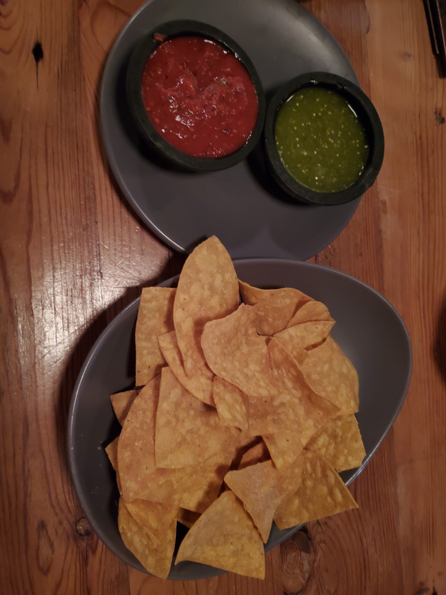 We also ordered chips and salsa. The chips are nice and thick, house made. They gave us the choice between red and green salsa; we asked for both. The green was clearly superior-- red had a smoky flavor, but a little too bland otherwise, whereas green was sweeter with a lot more flavor. Would love to see a spicier option (the server said red was spicier-- we didn't agree, at least as made the night we dined)