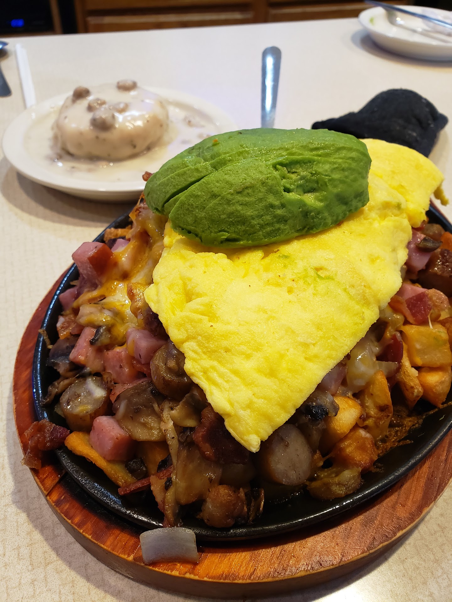 Presentation-wise, this dish arrives as a heaping mountain of breakfast greatness. Think fresh, steaming eggs perched atop a bed of subtly spicy meats, finished with a fresh slice of creamy avocado (as requested). It’s a masterpiece of simplicity and satisfaction.