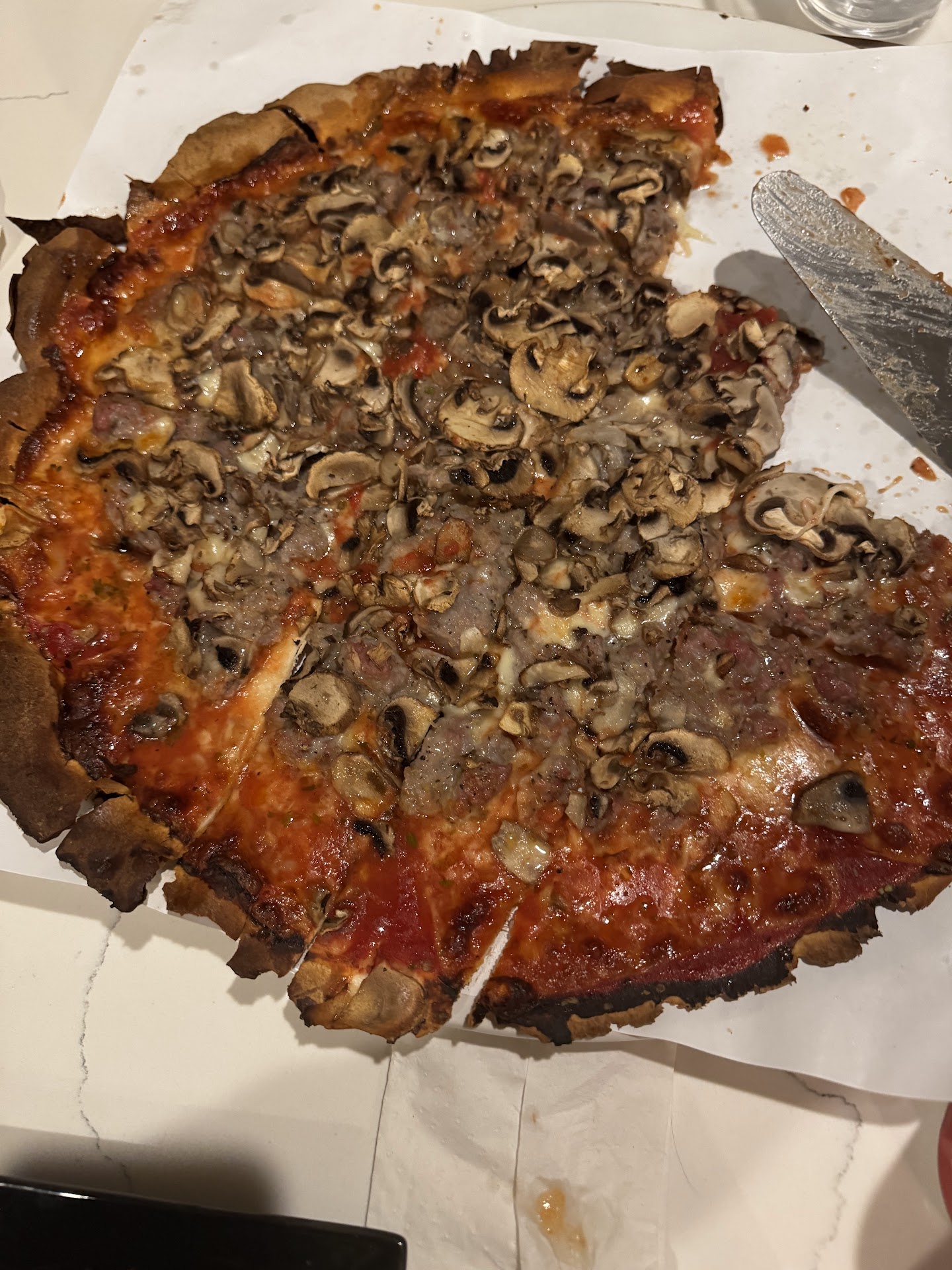 Food 5/5: The pizza came out hot enough to have to wait a minute or so to be able to eat, which is perfect, I had seen previous pictures of their Pierri Special which is double sausage and double mushroom and I did not want a mountain of mushroom on my pizza so I ordered mine with double sausage and single mushroom. It came out perfectly portioned with sausage and mushroom in every single bite I had. The mushrooms were cooked down to perfection and had a very good flavor. The sausage is the part that surprised me the most, other places I’ve looked describe it as home made and I have to say it is the best sausage I’ve had on a pizza in a long time. The texture is perfectly uniform and it’s salted just right. The sauce isn’t over powering and compliments the toppings perfectly without being over applied. Crust is thin and can be very browned verging on burnt in some places but the bitterness compliments the pizza when you get to it.