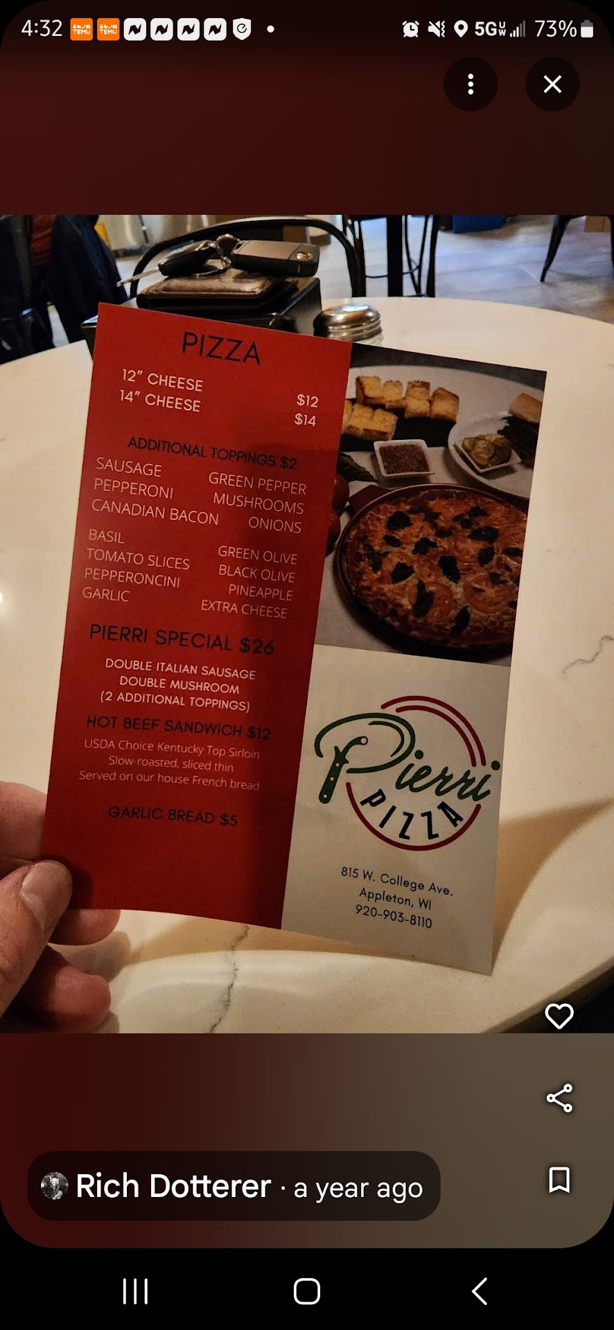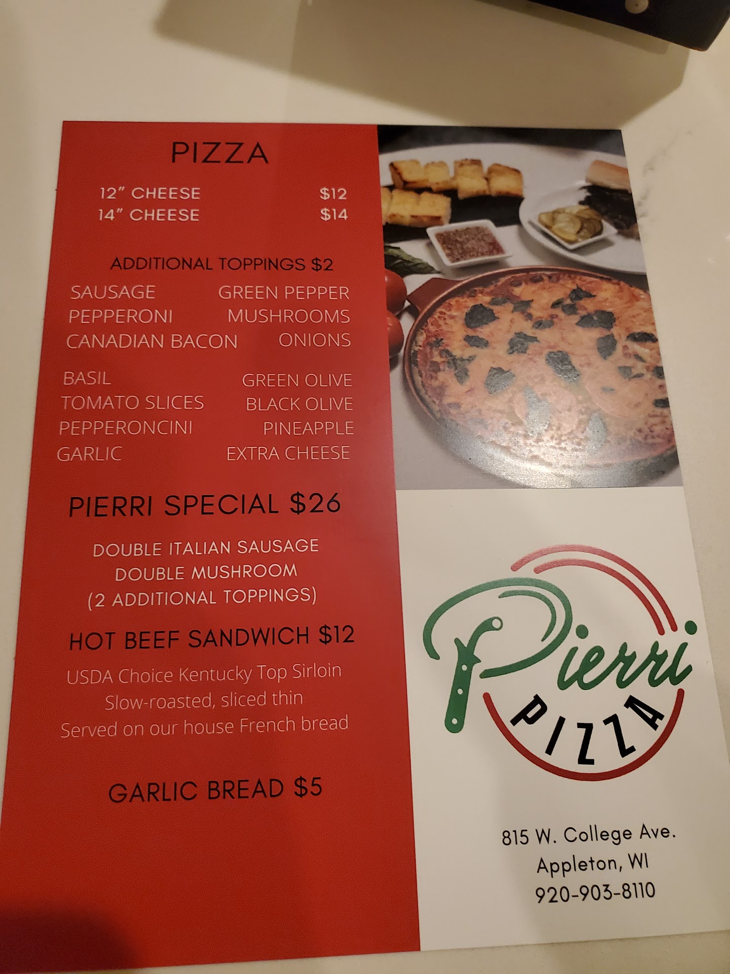 Read moreWe always enjoy our Pierri Pizza! APPLETONS MUST STOP!! We love Pierri Pizza. It’s an amazing thin crust and plenty of fresh toppings. Last night we split Hawaiian one half and sausage & mushroom the other half. My youngest daughter begged for her own large pepperoni with extra cheese- she needs leftovers. It’s what she asks for the day after for breakfast. My own personal image -is my 10 year old grinning ear to ear with her own large pizza directly in front of her. And she’s not sharing with us either! Ha! The owner is really sociable and came over and personally brought boxes for our much coveted leftovers. Overall, you can invite your closest friends and impress them with the fresh authentic flavors & reasonably priced and open atmosphere with music at Pierri’s. You’ll be happy with an extra take home pizza too from. the frozen section. We can’t express enough how great this experience is- we go as often as possible....