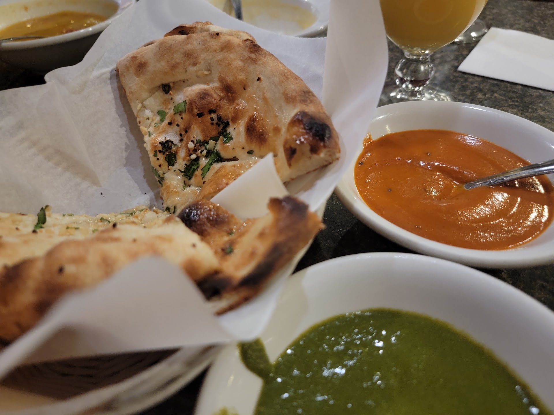 The restaurant has a darker atmosphere due to the dim lights and dark colors of the wall. You have the option of booth or table. No bar/bar seating although they do serve alcoholic beverages. The décor is very Indian theme as you would expect and you can enjoy Indian music as you dine in. The restaurant is on the smaller end and be prepared to wait during prime dinner times. Especially on weekends.
