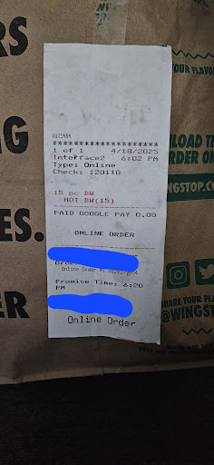 My wife loves WingStop and after a long time of not being able to accept online orders (perhaps that should’ve been a clue), we finally ordered some tonight. The order said it would be ready in about 45 minutes. Cool. I get there and give them the name on the order. It’s not ready, but I was a few minutes early so I give them the benefit of the doubt. However, I keep seeing customers go through the door like it’s a roundabout because they keep telling them it’ll be a 45min-1hr wait. Most of the tables are filled with people waiting for their orders. They keep calling names out, none of which were ours. Fast forward about another hour. The people who ordered after I came in received their food. Now I’m annoyed. I get up and look over at the online order shelf which now has a few bags on it (also, I should note at this point their receipt printer must have been low on ink because some of the receipts were handwritten, and they are calling people up by what their order was instead of their names. So no one there apparently knows how replace the ink?). I see a bag that looks like my wife’s name, albeit misspelled. I ask the kid at the counter if that’s my order, and it certainly was. No one had called out the name. But even if they had, it would’ve been hard to hear them since they decided to put the tv up to 11. Probably not the best idea when you have a restaurant full of people waiting for their name to be called. Oh yeah and I had to remind the kid about the drinks on the order since of course they’re not checking that. To top it all off, the food was cold and mediocre compared to WingStop literally anywhere else. The other review that said you’d get your food faster if you were to drive up to Green Bay and come back to Appleton...