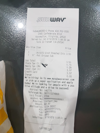 Read moreMy wife and I were traveling and decided that this would be a quick lunch. Wrong! When we arrived there were 3 people in line. The first two were handled as usual. To set the stage, three people were working: a man was taking the order, a lady was adding the toppings and a lady was working on to go orders. When it was our turn he took my wife's order and her sandwich moved down the line. He then got busy with the cash register. Following that he just disappeared. BTW: I was the only person in line. My wife's sandwich was sitting by the register as I just stood there. He reappeared but made no move to even address my presence. Finally after several minutes he told me that he would be right back. All the while the other two ladies were busy with the to go orders. Finally he reappeared again and ask me what I wanted. He made my sandwich. When it came time to pay he gave me my total, I inserted my card and he left. I stood there fir a while and finally asked one of the ladies if I was good to go. They checked and said yes. I took my sandwich and left - never to return. I'm not sure what his issue was but we experienced most likely the worst customer service...