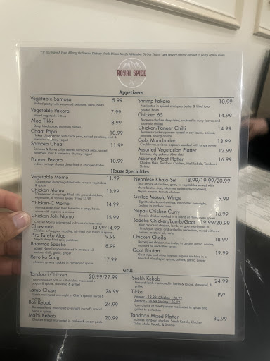 Ā Ā Ā Read moreWhere do I start⦠This place really lived up to its reviews. The wife and I were in town for the weekend for business and decided to try Royal Spice. Let me say they did not disappoint. First food that came out was the Papadum and I could eat them all day. The texture was amazing not too hard and not too soft just right. We also ordered the tandoori wings for the appetizer. When I tell you there was flavor in every bite. I would never lie to you lol. Oh did I mention I only like drums and my wife likes flats. I didnāt even mention that to the host and they still made it an even mix. The attention to details..wow. For the entrĆ©e my wife ordered the butter chicken, I ordered the lamb chops Masala, and our bread of choice was the Garlic Naan. The lamb was perfectly cooked, the rice was made to perfection, not overcooked or uncooked, just right. Iām not a bread person but the garlic naan, I couldnāt get enough. Iām so full I wrote this long review cause I cannot get up and go to my car yet. As far as ambiance this place is very welcoming and they definitely have the confidence youāre going to love their restaurant and more importantly their food. Best Indian food...