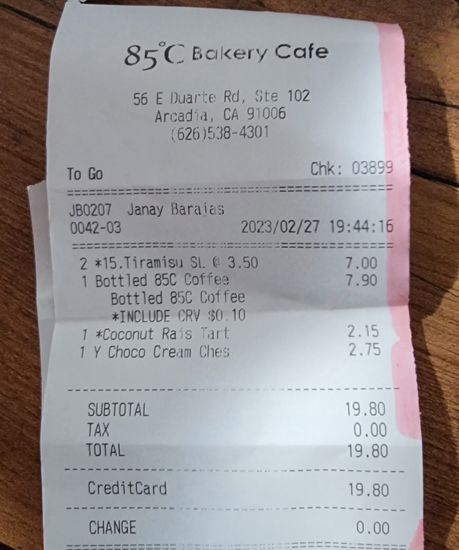 Read moreI am writing to express my deep dissatisfaction with the poor service that I received from one of your employees, Janay Barajas, during my recent visit to your establishment. As a loyal customer of 85 Degree, I have always had a great experience at your Arcadia (56 E Duarte Rd, Site 102, Arcadia, CA 91006). However, my recent encounter with Janay Barajas has left a bad taste in my mouth. Upon arriving at the store, my group and I stood in line waiting for our turn to order. Despite being ready to place our order, Janay Barajas completely ignored us and instead chose to serve another customer who arrived after us. This was already a frustrating experience, but it only got worse from there. When Janay finally turned his attention to us, he was extremely rude and dismissive. We clearly pointed out the cake that we wanted, but he kept asking us repeatedly what we wanted as if he was not listening to us. He was very impatient and made us feel like a burden, despite the fact that we were paying customers. It was extremely disappointing to receive such poor service, especially as loyal customers of 85 Degree. Janay Barajas' behavior was unprofessional and disrespectful, and it has left us with a negative impression of your...