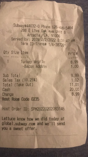 02/02/22 8:31 pm I had a spinach turkey 🥒🥬 🥓🫔 wrapped with bacon and veggies on vinaigrette , lastly Parmesan dressing the 2 guys had a big 5 footlong order they managed to do those orders and help me at the same time what a job 😓I appreciate their hard work and service . My Wrapped was delicious 😋 I’m coming back, this guys make a team together the place was clean and the veggies and meats were on fleek their best freshly presented and prepared nicely done ✅🤩 other subways late at night their veggies and meats look 👀 terrible , messy set up and not fresh thanks 🙏🏽 🙂 for your customer service this guys deserve a raise in pay or a...