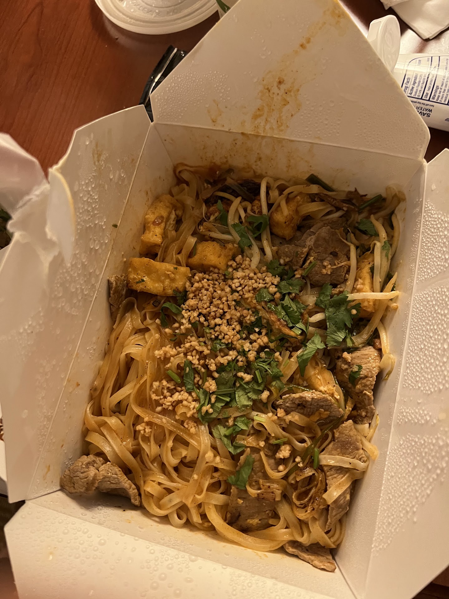 Well, I ordered to go & after tasting Thai food from all over the US, I was very disappointed! When I phoned in my ordered the girl said "they are swamped" & "that it would be a 1 1/2 hour wait till it would be ready" I told her that was fine. As I was driving there (I still had 30 min left) my phone rang with the girl asking if I was picking my food up, cause its ready, I told her I was on my way. The place was nice & quiet as there were only 2 couples dining. I went to the counter to pay, the girl said, "it was $72." I said "it must be some good food for that price!" figuring I'd check it out at home. the bag looked awful small to me! It had to be the most tasteless Thai food I have ever had! It was very greasy & everything tasted the same! For 2 people I ordered, shrimp pad Thai, pork pad Thai, 2 chicken satay (they didn't have beef) & a pineapple fried rice. Even the peanut sauce wasn't right, it was runny & seemed watered down, normally they would ask how spicy would you like it, not here, everything was the same, burn your mouth hot! I was so let down, I felt so ripped off! Needless to say, I won't be coming back! Much too spicy & pricy for me! For that price my dinner should have come...