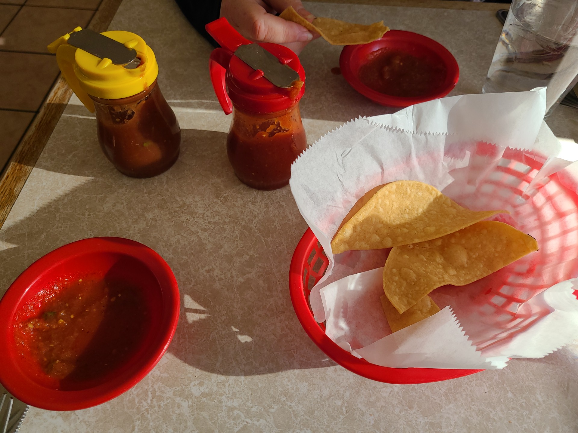 Chips and two sauces, red hot and red chunky brought promptly. Tortilla chips large and distinctly home made, sauces in syrup containers with two plastic bowls with very good flavor.
