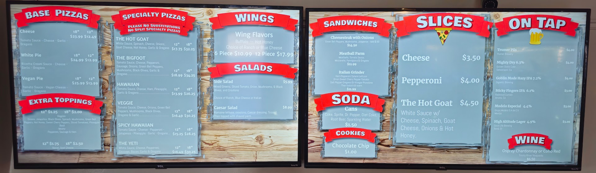 Pizza was edible and some bites were pretty good. The center of the pizza crust was pretty undercooked. The crust itself when cooked had a good crisp texture but was pretty bland in taste. They are very generous with toppings, which is a nice change for a local spot! Tons of extra bacon on the Yeti! Cheese was good! High quality- good cheese pull! Veggies on the Bigfoot- lots of them but also bland. A little salt would have helped. Probably twice as many olives and mushrooms as bell peppers and onions and too many made it a little bitter. The sauce- when I actually tasted it- was good! My party and I could barely see let alone taste the sauce for either the Yeti or Bigfoot. The staff were nice, pleasant, helpful and speedy! No issues there. Overall, an okay pizza with pretty good service. Some small tweaks...
