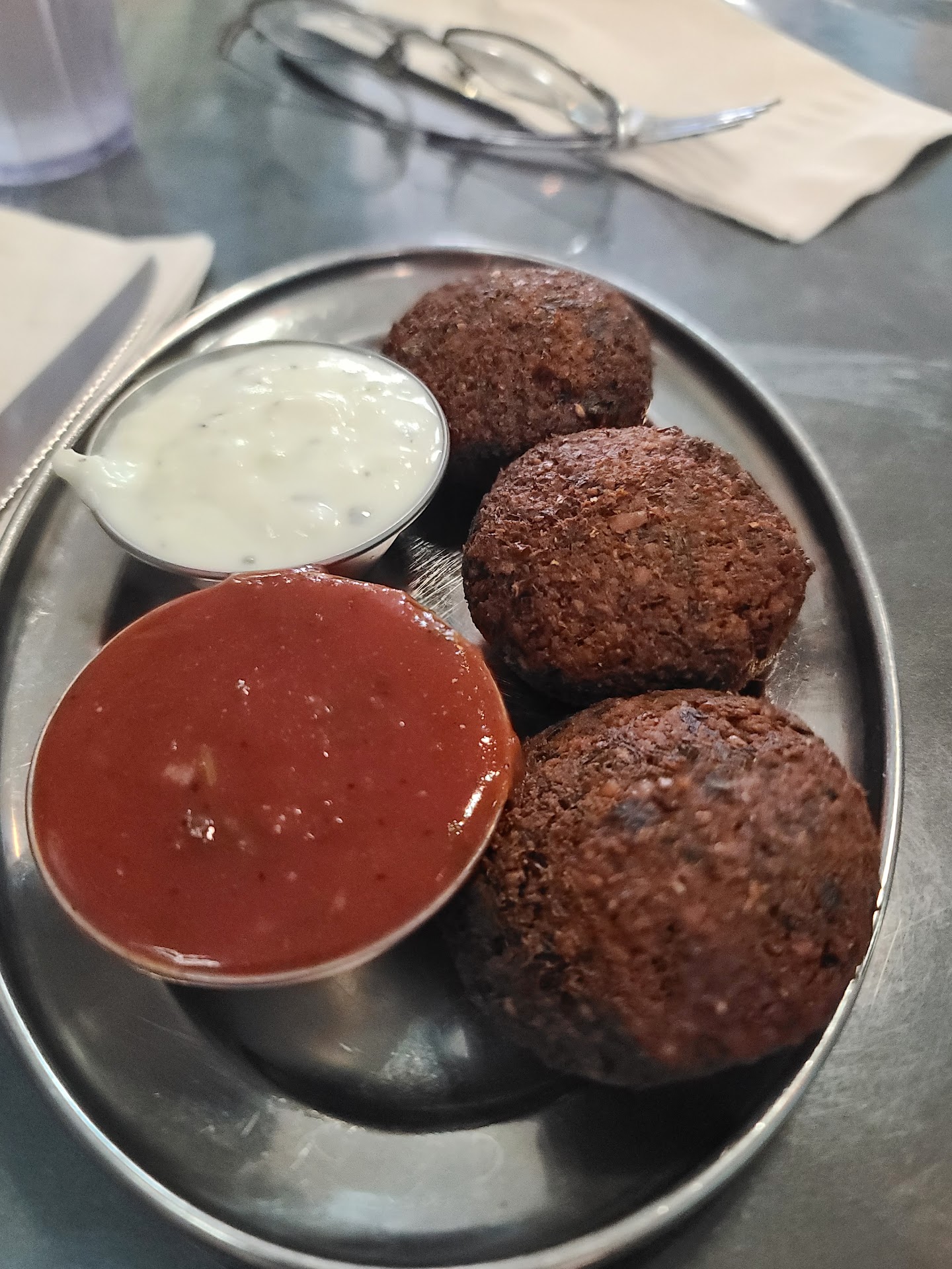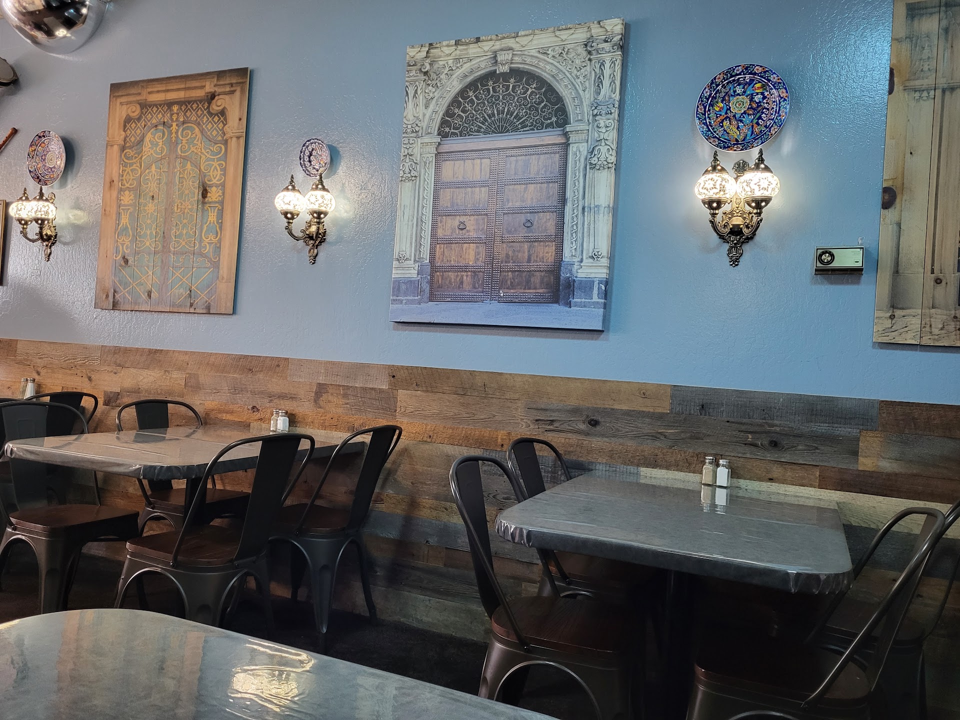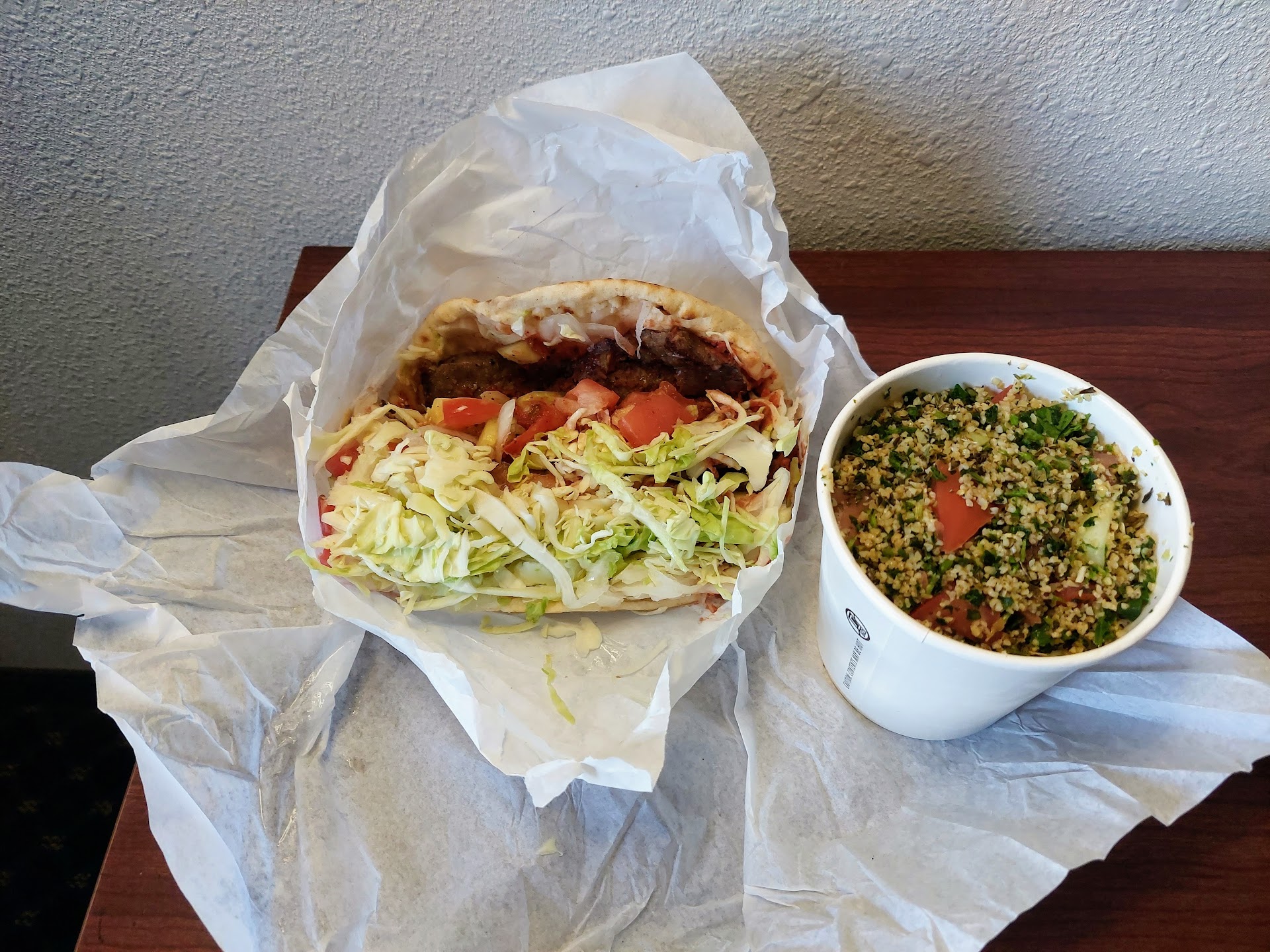 Compact space with six tables and some stools next to harbor freight tools. Order at the counter from somewhat confusing menu. Fast food served on plastic with metal fork, beverages in cans or bottles or a plastic glass. Food is fresh and flavorful. There are hot sauces available in squeeze bottles, if you ask, there are sauces and flatbread on the side menu. The red pepper sauce in the stainless cup is mild. Hummus taziki and baba ganoush are all good. They don't make their own flatbread there, but they make their own falafel and it's very good. The habanero hot sauces with or without mango are homemade and pretty good. Staff of three are friendly and efficient. Food came out pretty fast with several other people there at lunch. We ordered lamb on a dinner plate, baba g with an extra bread and falafel sandwich with a cola for about forty bucks. I'll try the falafel...