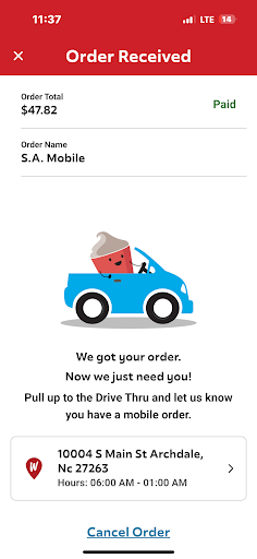 Mobile order# 1314612057 (This interaction took an hour of our time and their time this was 2hrs before they close this is from memory but there wasn’t an argument or anything just very unpleasant situation) I pulled up to the drive thru only to have no-one answer the intercom this has happened multiple times before so I was expecting it tbh, but I had already made the mobile order so after waiting seven minutes I pulled up to the window only to have them with their back turned to the window already cleaning the frosty machines which I get I’ve worked at a Wendy’s, so I went back around and on the intercom (still haven’t answered yet) hey I placed my order on a mobile order I noticed you were cleaning your machines the mobile order won’t let me cancel are you able to cancel the order for me? (They pick up) them: welcome to Wendy’s how can I help you? Me: repeating what I first said Manager: can you pull up to the first window I pull up Manager: we won’t be able to cancel it you’d have to do it from the app and the frosty was too liquidy I can’t serve you that or I’d loose my job (never offers substitute or refund) Me: it’s not letting me cancel it gives me an error Manager: the only order we have is from (insert random two initials) and tells me their order Me: that’s not what I had Manager: pull up and we’ll look for it I pull up only to see cooks sitting in the lobby I see manager walk up to them and talk to them and they just stand there before coming back out to me (when I worked at Wendy’s we were not allowed to sit in lobby unless we clocked out temporarily) Manager: have you tried calling the DoorDash number? Me: I did they said they were closed, well I didn’t call the DoorDash one but I didn’t have a DoorDash I just had a mobile order Manager: well someone picked up your order 2-3 hrs ago Me: we only placed a mobile order like 30 minutes ago? So I’m a little confused on how it was picked up 2-3hrs ago Manager: *shrugs and then goes to go back inside after asking me to call the DoorDash people