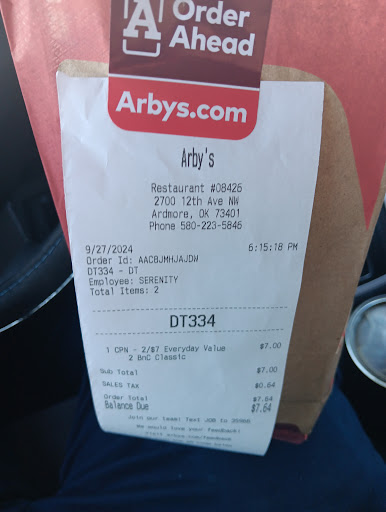 Read moreMy husband and I stopped in at the Arby's on 12th St in Ardmore to try the new fish items. I had the 3-piece hushpuppy-breaded fish (5-piece available) with crinkle fries and my husband had the Cajun fish wrap with curly fries. I guess the pandemic did away with the comforts of dining in, as the ketchup, sauces, etc. were now available only on request, and food trays were replaced by to-go sacks. But the food was good and hot, and that's what's important. The breaded fish is basically a filet cut into 1×2 inch chunks, and they were just out of the fryer with good flavor. The Cajun wrap was good too, not too spicy. The wrap itself was a bit thick in places but still lended a great texture to the fish and lettuce. Both fries were perfect. The store was clean and our order took just a bit over five minutes. The two of us had lunch for less...
