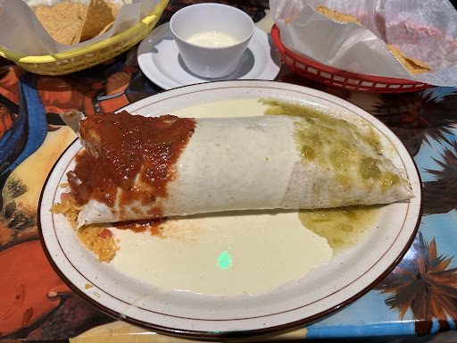 I ordered the Bandera Burrito, with the three sauces, mimicking the flag of Mexico. The menu boasted about it being filled with shrimp, steak, and chicken. My assumption upon ordering was that the listed beans and rice, lettuce, tomato, and guacamole would be alongside the burrito. Upon arrival, to my surprise was that all the listed ingredients (including listed toppings) were inside of a huge tortilla, topped with the three sauces. Upon arrival, the plate looked great! The burrito was huge, and the queso, good grief! That stuff is suspect-fully flavorful. I could seriously down shots of that stuff all by itself. Back to the burrito, and the major issue I had with it. Upon slicing open the burrito, I found what I expected once it arrived at the table. The beans, rice, and shredded lettuce made up for about 90% of what was inside the burrito. There were a total of three shrimp, which were flavorful, a very small amount of thin pieces of steak, and a very small pinch of shredded chicken. There were small strips of fajita peppers and onions but very few. As mentioned above, the ratio was very unbalanced. Full transparency, I obviously know that the burrito would not be overflowing with shrimp. , chicken and steak, but at a price tag of just under $18.00, the amount of cheap-filler ingredients definitely did not justify the price for this burrito. This sticker shock is the reason for my mediocre score. All other aspects of our experience were 5 stars. Also, I may have to look into Queso rehab. I can’t stress enough how good that...