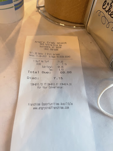 Read moreThis has to be one of the worst places for service. My family and I wanted to enjoy a meal at the angry crab shack, sadly that didn’t happen. The appetizers came out 20 seconds before the main meal. Well, at least most of them… my mother ordered a salad with grilled chicken and it did not come out right away. It took an additional 25 minutes for her to get her meal while everyone else was trying to enjoy their aggressively average food. When her meal finally came out, it was the wrong chicken and we were very perplexed as to how they messed it up. They gave her fried chicken, thankfully she doesn’t have a gluten problem, or we would have been in some real trouble. The waitress said that she would talk to her manager to see if she could get get it removed from the tab. We get the check and not only did they include gratuity for a small party, but they only took off $1.80 for the whole salad. We had politely said we would be okay without the salad, but they still brought it out wrong and made us pay for it. Needless to say if I was bad at my job, I wouldn’t get paid. I am perplexed as to how this business model even makes them money. The manager was too afraid to come to the table to make up for their mistake. I don’t like confrontation either, but I always own up to my mistakes. Anyone with a brain would have come and apologized. I suppose there is a reason they only have restaurants in Arizona and 2 other states. Gonna be hard to expand when you are bad at your job. Anyway, if you are looking to have poor service and a bad atmosphere, please indulge here. The angry crab shack created some...