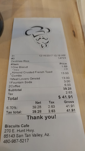 I recently visited Biscuit's Cafe in Queen Creek, Arizona on January 3rd, 2023. Previous visits were consistently great and I have had no complaints regarding those experiences, but this last was disconcerting. I took my two young granddaughters there for breakfast during their Christmas break and we were all looking forward to another great meal. I was a bit surprised by how few customers were in the restaurant when we walked in, but didn't think that much of it. It was unseasonably cold outside that morning and I was looking forward to the warmth of dining inside.