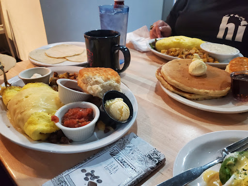 Read moreOur server was fantastic! He was kind, attentive, and let us stay for as long as we wanted. He deserves a raise. I got the eggs Benedict while my friends got the chorizo omelet, pancakes, and biscuits. The eggs Benedict came out cold. The eggs were cooked nicely. The hollandaise was fine but nothing to write home about. Excellent sized portion of avocado!!! My biggest gripe was the English muffins. They weren't toasted. They also had a wet slice of tomato on top of their unbuttered selves. So, they sat soggy and sad at the bottom of the pile. They were chewy and not in a good way. I got red potatoes. They tasted like they were cooked in reused or old oil. Maybe they weren't but whatever oil they use gives it a funky flavor. I didn't like it. The pancakes taste like vanilla cake. Like... cake mix cake. They are very soft but have none of the diner crisp or buttery goodness of a good pancake. The syrup is, well, plain old maple flavored corn syrup. It's not my thing. The biscuits are super thick, super soft, and very dry? Not dry like there isn't enough liquid in the recipe but dry as in you'd better have a good dollop of jam or gravy to help you choke it down. They remind me of bisquick. The omelets were made separate from their filling. Which is a choice. The fillings I tried were kind of bland and salty. But I'm not a fan of omelets in general so don't let me cloud your judgement. Honestly, my favorite part was the stack of whipped cream on top of my hot cocoa! I think I'll stick to making my breakfasts at home. Oh! And word to the wise do NOT get the sausage patties. They are heinous and would be better suited as doggie treats. No offense to anyone that likes them but the links are much,...