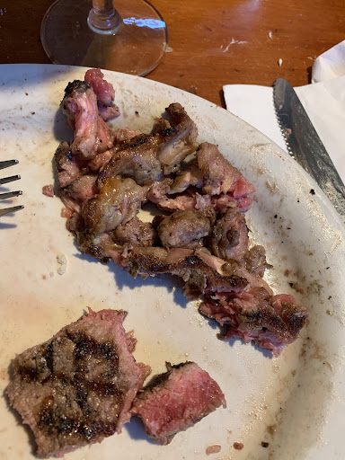 We both ordered the ribeye (my favorite cut) she got the smaller one and I got the larger (more costly) cut. When our food arrived it looked good and we began to eat. As I was eating my steak I tried to like it but I just wasn't pleased. I had ordered it as rare as they would cook it and it was dry, over cooked and pretty flavorless. I asked my wife how hers was and she said it was great. I tried a piece and you know what?... it was. Her cut was very good. Moist, tender and delicious. I sat there wondering how they could have messed up my cut so bad. When I flipped my piece over I could see why. The cook (I won't use the word chef here) had cut slices into the bottom of the steak. No doubt to help it cook faster but this had dried out and destroyed my meal. I left unhappy.