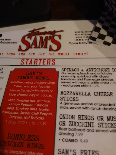 Best Famous Sam's in town. Has a long history of being a great spot for Sunday NFL football as well as Monday and Thursday night games with a long history of being a great Friday and Saturday night hot spot for dancing with great live bands and dj's thru out the whole time since it opened its doors. The Philly Cheese steak is excellent here as well as the South west chicken salad bowl...you never can go wrong with the hot wings here which are my personal favorite because you can get up to 3 different flavors on one ticket (as long as you get at least 6 of each) I am a regular here and usually get teriyaki, garlic parmesano and medium hot...they used to have mango-raspberry chipotle sauced wings which as far as I'm concerned the best ever! but unfortunately was discontinued because of the company that created the sauce went out of business. I go here at least once a week for a tall glass of Coors Light, a shot of Jack and wings and love the kicked back atmosphere. There's a pool league on Thursdays (if my memory serves me right) and it's always a happening hot spot because this Sam's is always busy day and night. I love this bar because the billiards tables are always open, pandemic...