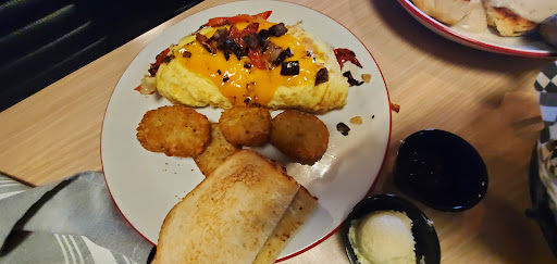 The omelet is good. The crispy bacon/cheese on it paired well. The omelet is super fluffy.