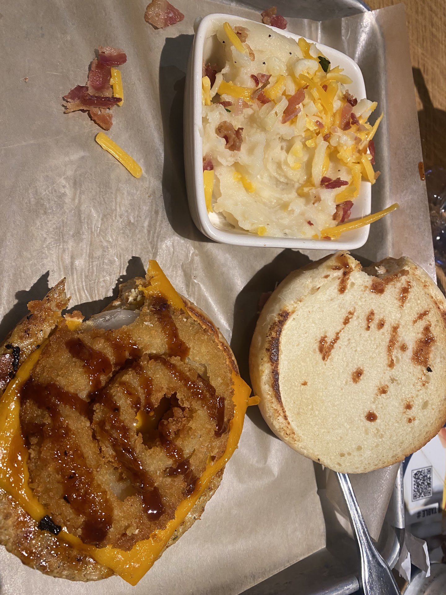Our main dishes were forgettable. • I had the Grilled Chicken Alfredo, which was bland and boring. • My partner had a burger, which was actually really good. • The bread was rock hard — like stale, not just crunchy.