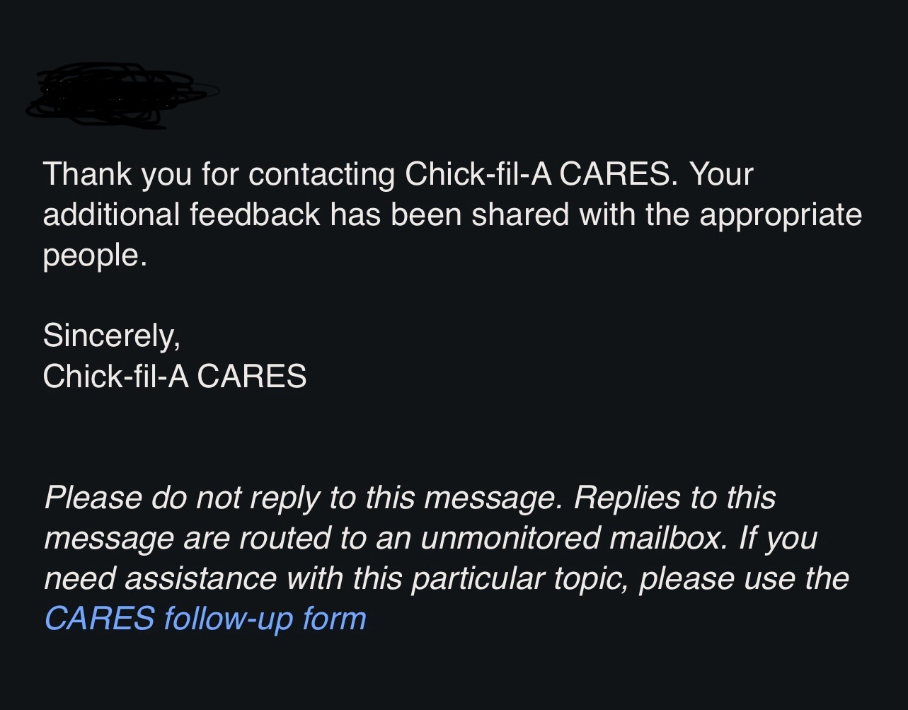 Read moreYesterday I met up my family for what I thought was going to be a quick lunch. All three of us all ordered salads & got seated. As I mixed up my salad I noticed a BUG in the mix of my lettuce & showed my family members , and we all confirmed it was in fact that. I took it up to the counter where someone causally apologized and made me a new salad. When I got back with my new salad, reluctant to eat it- my sister found a fly in HER salad as well?! Grossed out , we took them to the counter and asked to talk to a manager this time as I didn't want to eat my other salad, worried it would have another fly in it, as she found one as well. The manager was much more understanding and pleasant. Our salads were almost $10, and we asked for a sandwich instead ($5) and nobody offered us a refund or additional items to make it an even exchange. Instead , Chick fil a made an additional profit off of us and this fun experience. I'm sure you can understand how we did not have a pleasureful experience eating a fly contaminated salads while losing our money settling for a sandwich. I've always had amazing experiences at Chick-fil-A but that was not the case this time. I was disappointed by the staffs customer service & efforts at making it right & after this experience I will not be back to...