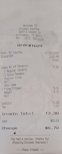 Read moreThis location is the closes one to my home and most of the time they've given my 3 kiddos and me some great food. The service is the same some are more friendly than others but either or I'm good as long as my food is fresh, my order is correct, and the deals are good. That said last night(2-25-21) after getting off earlier than normal I was finally able to make it to this location before it closed. The person who took my order was ok I could tell she was pressed because she made sure to tell me what they didn't have(Reg Chicken Tenders) and that if I ordered, they would take 10-15 minutes and they close at 10pm. My kids and I Loveeeee there Chicken Tenders both Regular/Spicy and since it had been some time since I've gotten to leave the hospital early I said I would still like some Regular and Spicy Tenders plz. She said you want to wait of which I said yes and I pulled around, paid, and waited. It wasn't until I made it home that we realized that the Reg were over seasoned and barely had any batter on them and the Spicy were spongy, they weren't fresh AT ALL. Only good out of this visit was the corn nuggets and our drinks, I understand that it was late (9:50pm) I got there as quickly and safely as I could(it was raining), but it's very disheartening to see people gladly take your money and be perfectly okay with giving you, ugly service and nasty food, food that ain't even close to what they would...