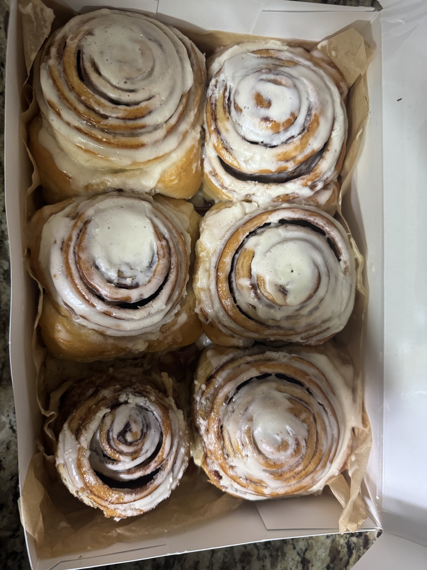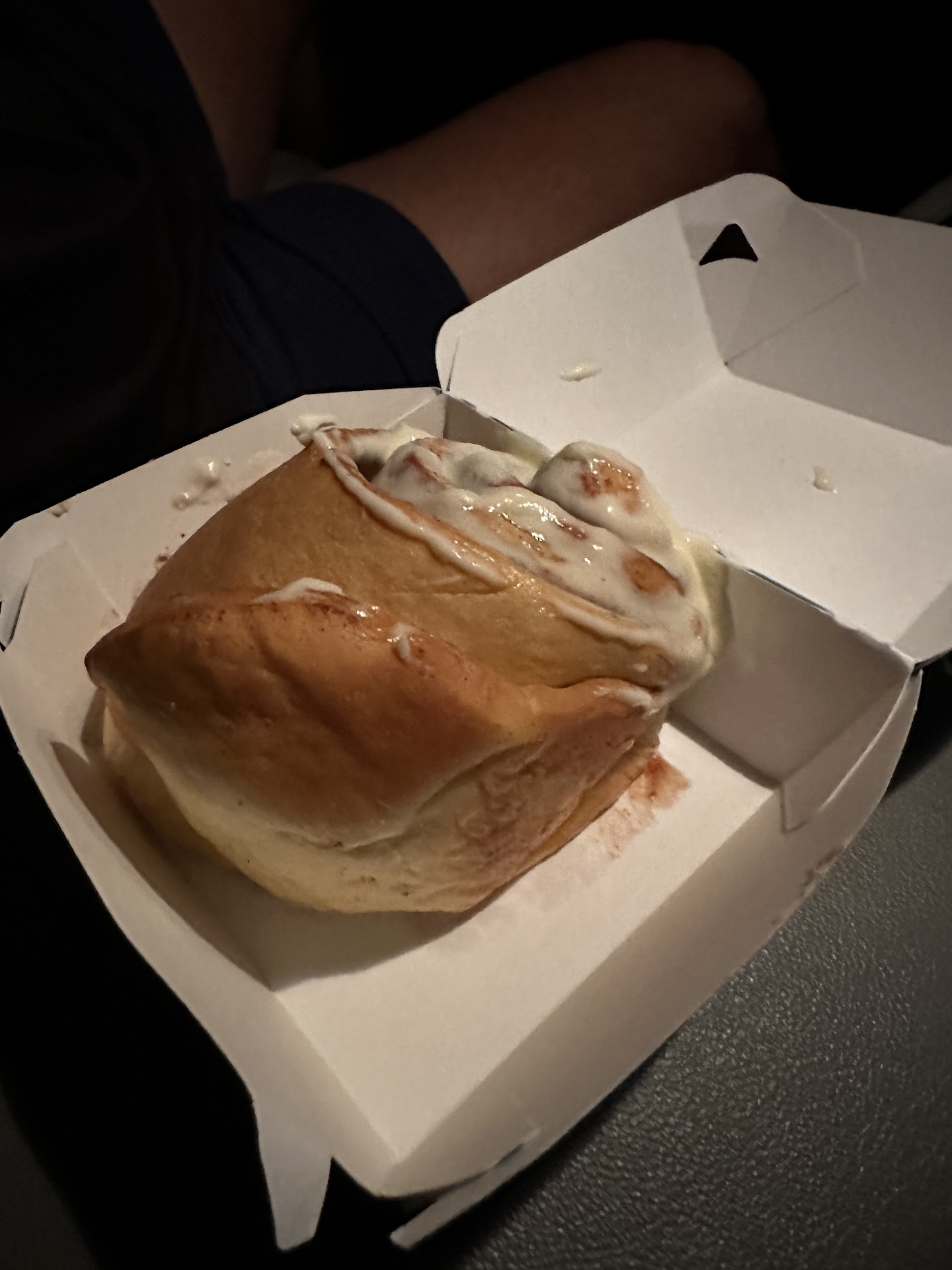 The worst cinnabon ever. Asked my kid to pick up a few cinnabon when they visited the mall. I opened each of the single serving boxes and saw these sorry cinnamon rolls. For the price of 1, I can get 4 at Walmart for less than that n could probably taste better. The dough was not prepped properly, not raised, you can see the bread roll being so thin after baked and so frail that it lays on the side. And bc the dough was not rised, it's chewy not fluffy n soft. The bread roll is so visible bc there is half the frosting it used to have.