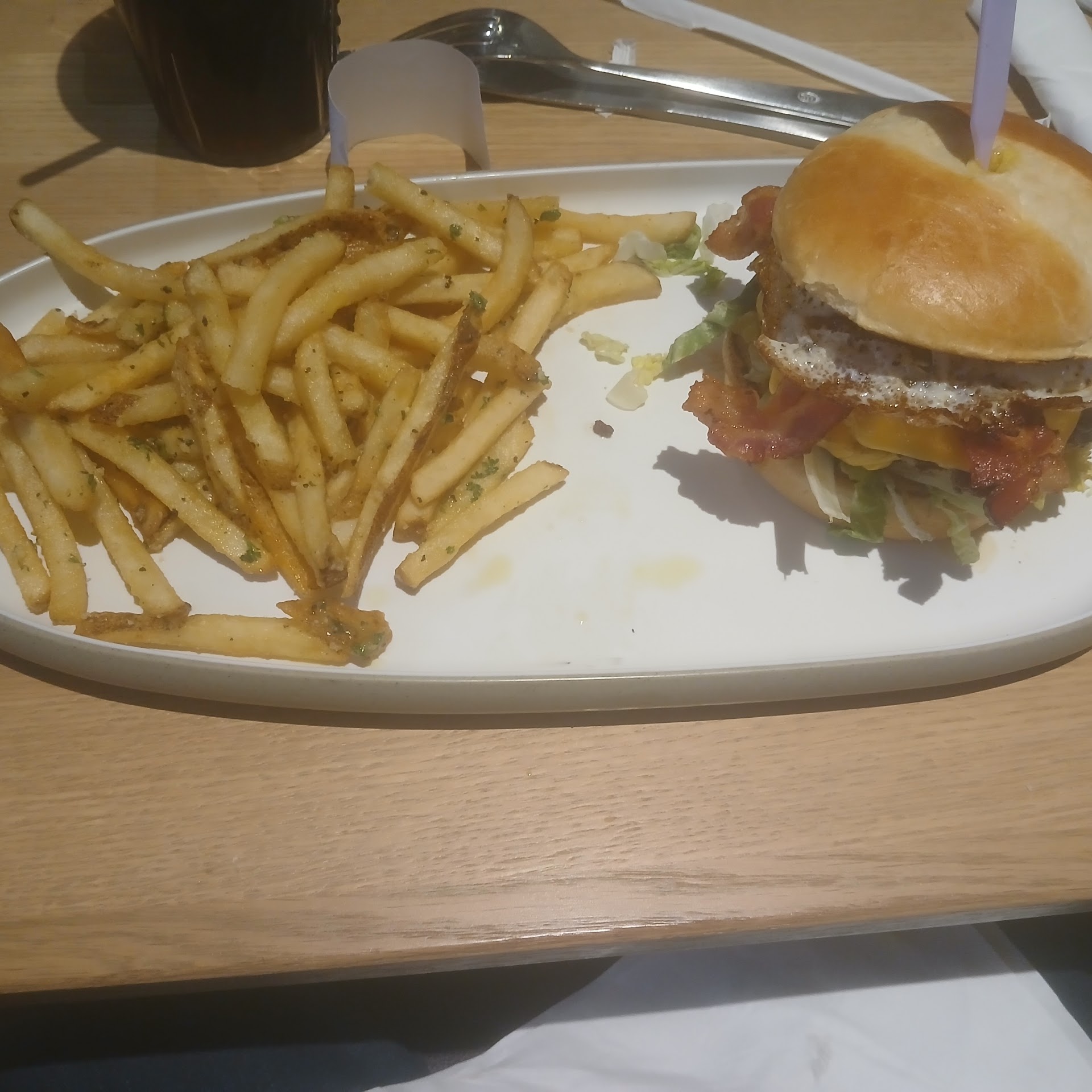 His service also ended up being sub-par along with the most of the food just being ok at best. The Brekky Burger (pictured) was pretty good, though, and the truffle fries weren't too bad, but some were almost soggy. We had to ask for one of our sodas a couple times before he finally remembered to bring it out..... after the food was delivered 🤦♂️ We also had to catch him walking by to another couple that came to dine in order to get our drinks refilled. BTW, that other couple and my family was as busy as it got the entire time we were there.