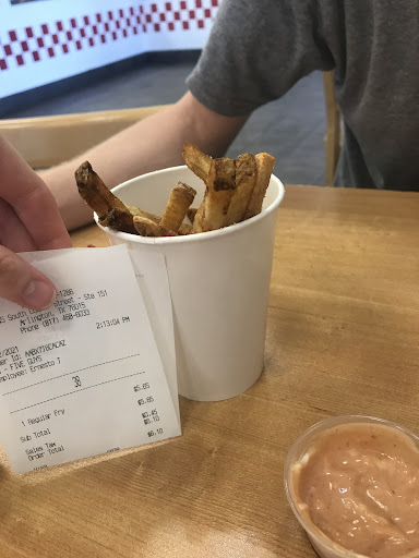 Read moreHoly cow....bad experience today. The girl who took my order wasn’t nice nor was anyone else who worked there. We got a regular fry to share- they just gave us a cup of fries, usually we get it in a bag and there’s extra on the bottom but the cup wasn’t even full. Plus we are pretty sure we got a small. All of them were soggy and we got mostly nasty ends. When I asked for Mayo to make a fry sauce they were like smirking behind the counter at me and the ketchup dispenser was out so I had to ask for that too. There were only a few other customers there so they had the time to do a better job and didn’t. On top of that- they knew it was bad. They wouldn’t even make eye contact with us while we were eating... I love five guys fries but obviously not here. The kitchen staff was arguing too, talking about some girl who clocked out and left without telling anyone. I don’t know- bad location but probably in the top 5 worst restaurant experiences I’ve had. Two stars for liking other locations. Totally disappointed 😞 but if corporate reads this can I get a refund?? 😂