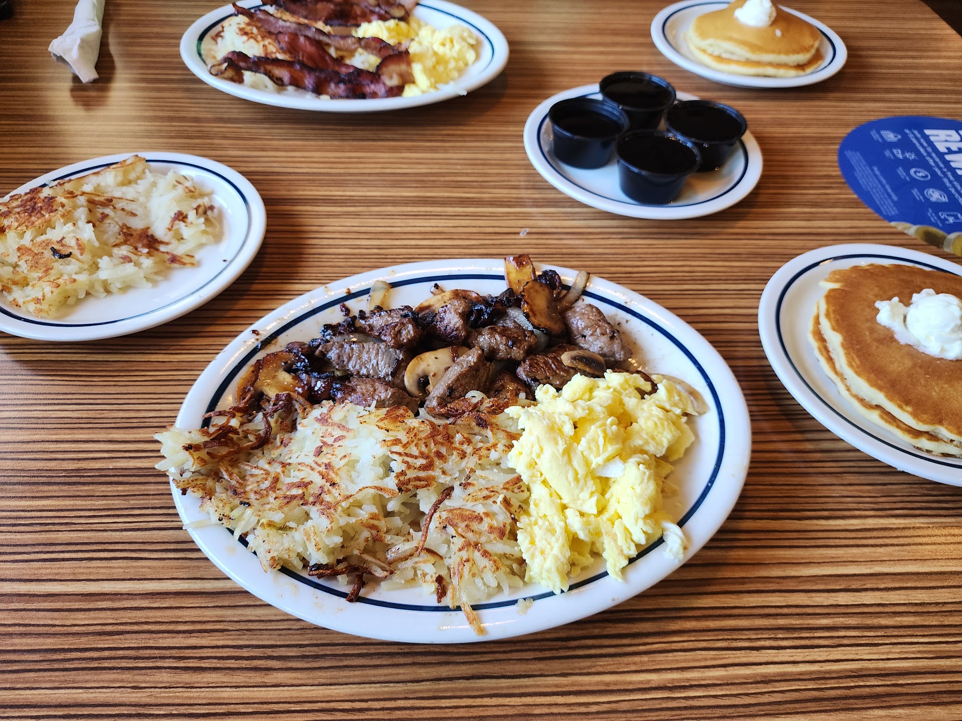 Read moreLast minute shift. Long line at another restaurant, so decided to go to IHOP. Walked in. MaÎtre d' asked size of our party. We said 2. MaÎtre d' said right this way as we walked to our booth seat. As we were just about to sit, the waitress introduced herself. Very pleasant. She handed us our menus. She quickly took our drink requests and brought them to the table very quickly. She was very helpful and even let us know of the special "All You Can Eat Pancakes", which was a better buy. I asked about Grits, but she said they are no longer on the menu. I then pointed to the menu to show her what I wanted from the picture because I did not know the name of the item. She verified what I wanted. I also added a side of hash browns. She repeated the entire order and quickly took it to the chef. I was able to go to the restroom. It was clean. I made it back to my seat. It was a very short wait before the food was brought to the table. Everything was hot and fresh. She even brought warm syrup. I prefer Butter Pecan Syrup and Blueberry Syrup. She quickly brought plenty of both syrups to the table. Everything tasted great. I have a large appetite, so the special "All You Can Eat Pancakes" was great. Each round of Pancakes is served by twos. I ended up ordering 3 rounds. By the time I finished my 5th of 6 Pancakes, I had no more room. At that time, the waitress brought the receipt. Great price for the amount of food. I asked the waitress for a To-go cup and container, and she quickly brought it. I then realized I needed 2 lids for my Syrups. She quickly brought them. Great food. Great service. This is 1 of the best IHOP experiences I...