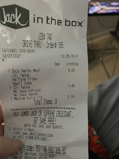 Read moreDon't waste time spending money here one employee tells us they are out drinks and tells us to go to another location on a previous time just a week ago then I try again tonight and I try to pull in and go between cones and pull up to drive thru they take my order and money once I pay a Hispanic man not in any jack in the box uniform comes to the window to tell me that they are closed to vehicle traffic because they are full from selling parking spaces for a event at the Cowboys stadium and I'm not welcome because it's private property and he's the district manager ok I say I'll just go to the one on division st he's says we own tht one as well ok so I can live without spending my money at any jack in boxes if they want to treat customers this way I live four blocks away and just because he's selling parking for events at this location doesn't make it right to turn away local customers another issue with this is I'm disabled and wear a prosthetic leg so parking a few blocks away is not something i can do hope y'all understand ADA law because I'm moving forward...