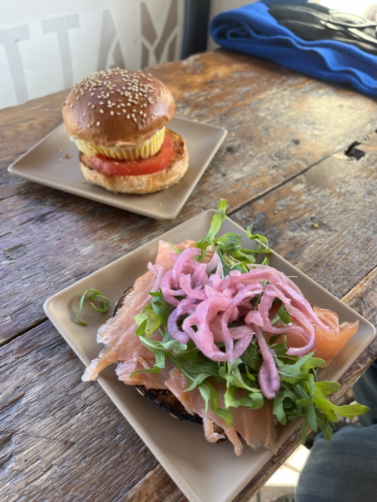 We decided to indulge in a salmon sandwich and an egg sandwich, accompanied by cappuccinos. The food was delicious, with each bite of the sandwiches offering a blend of fresh flavors that complemented the outdoor setting perfectly. The coffee, while satisfactory, didn't quite reach the same heights as the food, but it was still a pleasant addition to our meal.