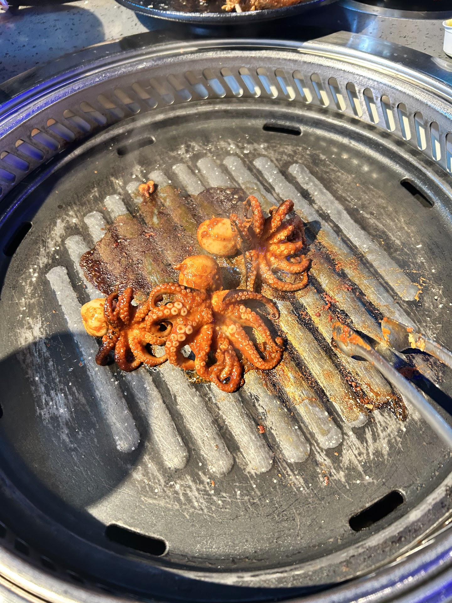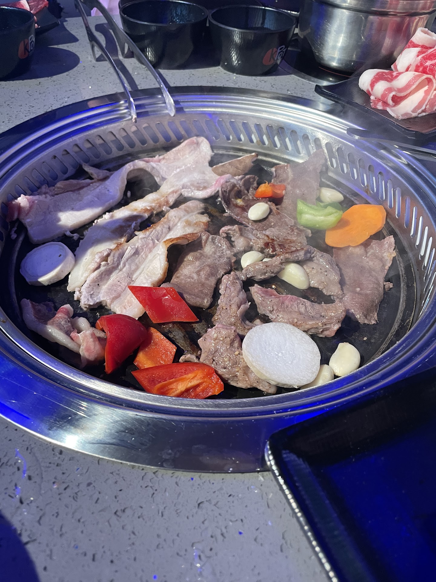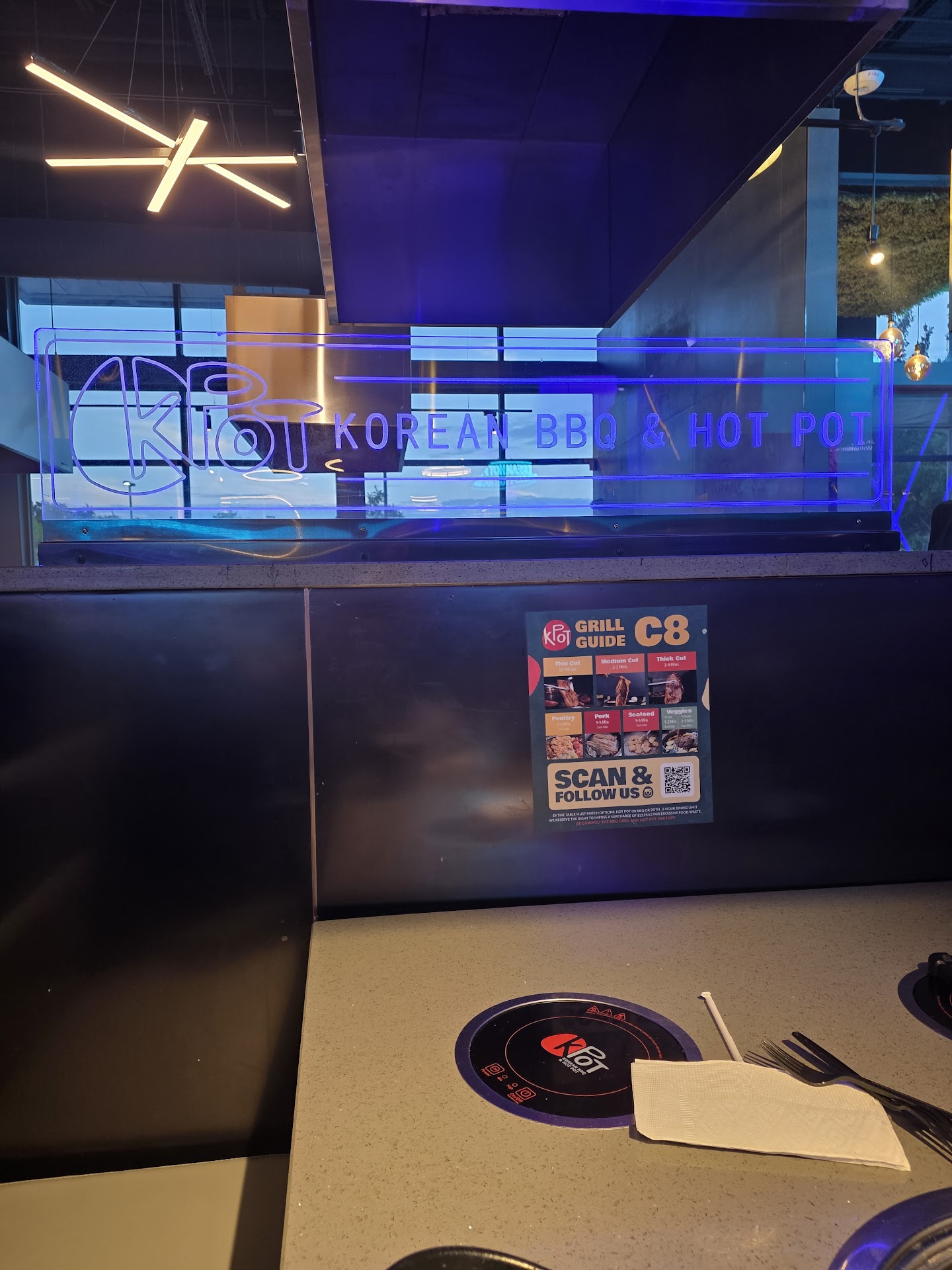 I must preface this by stating that I am a Korean American and judge all Korean cuisine to a high standard. Chances are my mother or myself can cook it better at home for a fraction of the cost. That being said, sometimes you just don’t want to cook! My family of 6 went on a Saturday morning at 11am, just as they opened. We were seated immediately and our waiter Sam greeted us very soon after. First impressions: he is not Korean, let’s see how this goes! He was very thorough on explaining how everything was set up and how to order from the IPad! He even gave us recommendations which were spot on! I have a hard of hearing, elderly mother who speaks in broken English and he was so patient and kind with her! Huge points for our family, as not all servers are accommodating. We all ordered both options, the hot pot and the BBQ. We had 4 different soup broths at our table, mine was the spicy seafood broth and it was delicious but I should have spiced it up a bit more with the choices from the spice bar. No complaints from anyone at the table! The vegetables, meats, and seafood we ordered for the hot pot were all so very good! We ordered the brisket, short ribs, bulgogi and pork for the BBQ. Outside of my own kitchen, the short ribs alone were worth every penny we spent! Very well seasoned and so tender and delicious! All the meats were delicious! The restaurant was clean, the food was incredibly fresh and well seasoned (we were pleasantly surprised) and the staff as a whole worked very well together! Our table was always being cleaned, the food arrived quickly and Sam was the best server! We will most definitely be back and hope to have a...