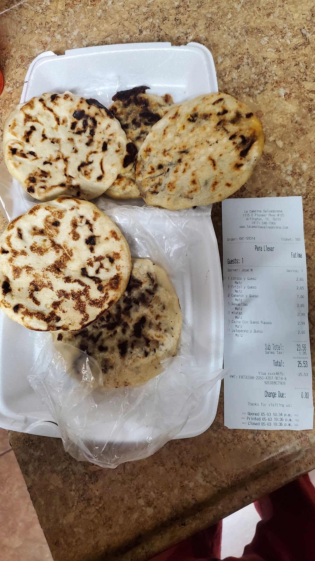 Read moreFood was amazing! If I could rate food (Pupusas is all we had) I would rate a 10 stars. But do yourself a favor. Call about an hour in advance with your order. Dine in or pickup. CALL IN ADVANCE! ESPECIALLY FOR PUPUSAS! This places specialty. Only reason for a 3 star is given is because of the wait time when dining in. Also no host, so, walk in, and pick your seat. Not bad on the no host, it was just awkward standing there not knowing if you had to wait for someone to acknowledge you or not. Walked in at 1927, stood in entrance area in view of waitresses for about 3 to 5 min. Figured out, no hostess. Sat down. No acknowledgement for like 10 to 15min. We already knew what we wanted so didn't even have to look at menus. Food did not come out till 2025. It's a very simple dish (pupusas). My grandma can feed about 20 people in about 30min. Especially when everything is ready to go and just throw on griddle. Either, the set up/prep/system is not what it should be or not enough staff. Not sure. Final word: Amazing food, way too long of a wait time...