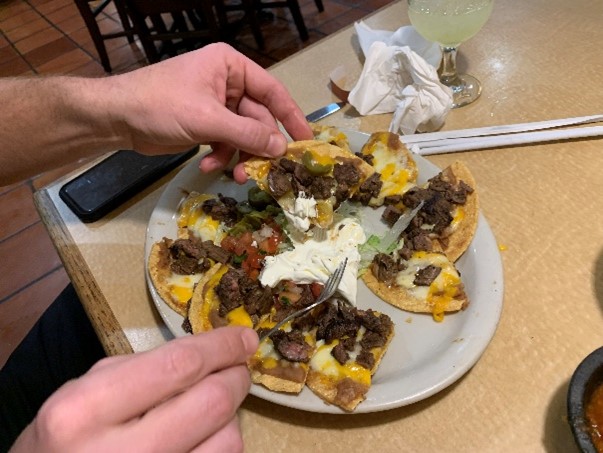 Others ordered the nachos with meat, beans, pico, cheese, and sour cream (on the side). We liked that they are created on each chip rather than toppings piled on a bunch of chips. The chips were slightly thicker to accommodate the toppings. Their fajita enchiladas are delicious and their tacos are stuffed with good meat, cheese, pico, and lettuce. Be warned! The ground meat is spicy! -...