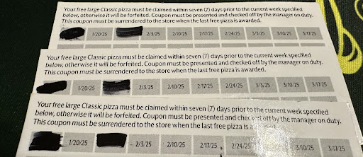 We’re grateful for the free pizzas, but this is a pretty dishonest way to do business. We’re going to keep redeeming our pizzas whenever they feel like honoring their own terms, but we don’t feel comfortable spending money at this establishment...