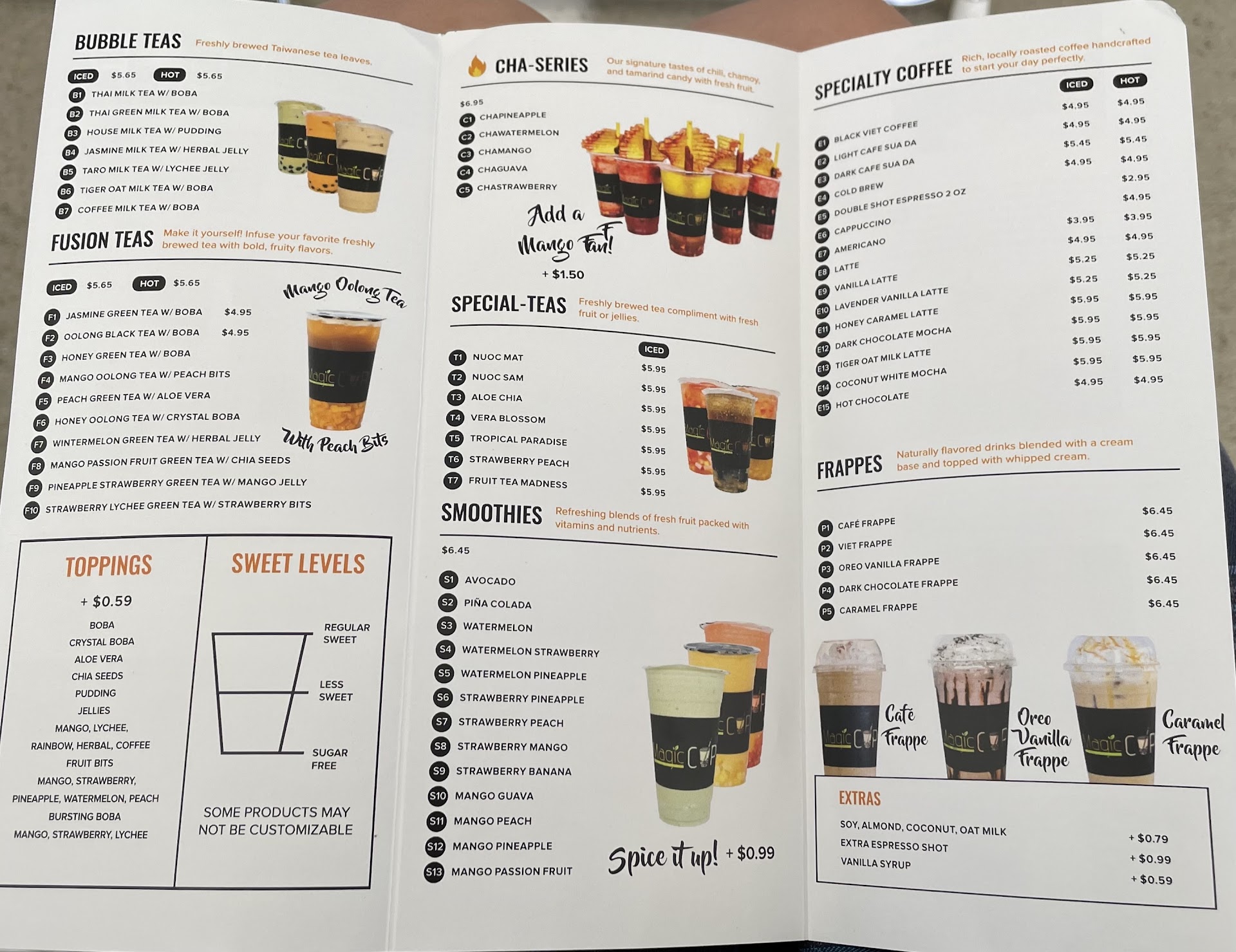 5/2023: This is the menu. $6.24 for a milk tea with boba. house milk tea (good) taro milk tea (good, very sweet) thai green milk tea (not enough sweetness) peach tea (good, sweet) Drinks came out within 10 min of ordering. Lots of seating, some board games (chess, jenga, apples to apples, connect 4), and partial view of the lake.