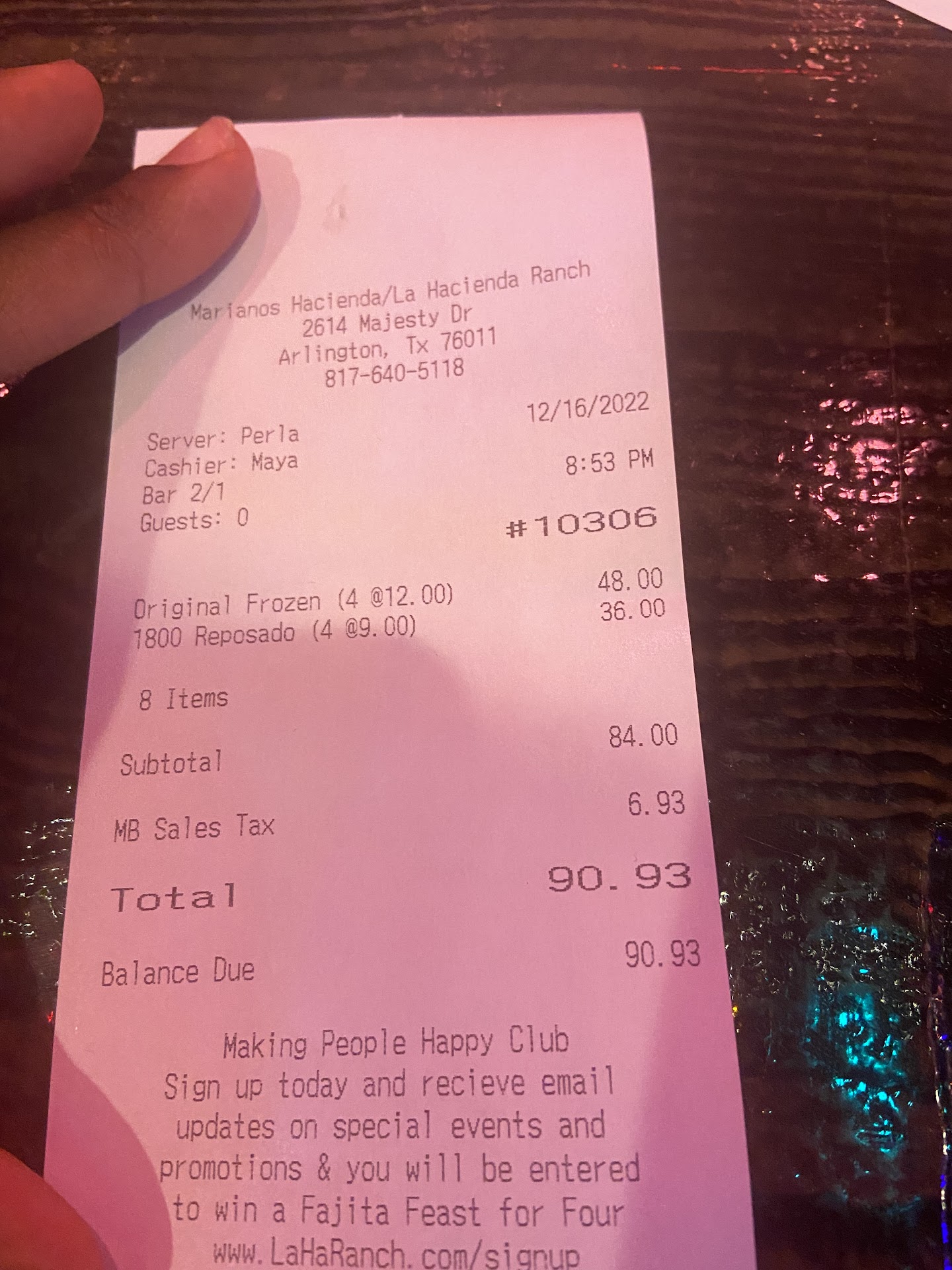 If you are anything other than Latino I strongly do not recommend patronizing this establishment. My husband and I tried this place out for dinner. We decided to sit at the bar as in theory it was faster than waiting for a table. The bar was filthy and sat there being ignored of service as Mexican customers walked up to the bar between us as we were seated, ordered and received drinks and walked away. A Mexican couple sat down at the bar a few chairs down from us and immediately received menus and were asked for their drink orders. I was appalled and should have left immediately but I was hungry and although I knew in that moment I wouldn’t be back, I decided to complete this visit as my first and last. That Caucasian young lady sitting next to me looks over and says to me “I have a feeling they don’t like serving everyone at this place, it took me over an hour to receive my food”. She flashed her phone at me as to show the current time was 8:55pm, then she stated I ordered at 7:00 before flagging down the waitress and asking for a to go container. I agreed and we began to converse about the poor treatment and customer service that we had both received. After that conversation and having some time to marinate on the rude seemingly racist treatment my husband and I were receiving, we decided to abort our visit without receiving our food. We flagged the waitress down after being seated for well over 15 minutes and asked for 2 house frozen margaritas and 2 shots. Her demeanor was rude and nasty. She acted as if we were bothering her. When she bought our drinks out she did not ask if we wanted a menu nor did she speak. She dropped the drinks and immediately walked to the other side of the bar so we sat there, finished our drinks as we waited for her to return only she never did. My husband flagged her down , politely asked for another round and a menu as if you should have to ask for a menu. Again, she brought the menus and proceeded to leave so we finished our second round of drinks and flagged her down to make our food order. The service was like pulling teeth although customers of latino ethnicity appeared to not be experiencing the same treatment. Concerned with the service we were receiving and after waiting well over an hour for our food and not being checked on even once voluntarily, we flagged down the waitress and asked to be cashed out. Here’s the kicker. We received a tab of $100 for our order of 4 house frozen margarita (served frozen out of the margarita machine in a short slim glass) and 4 shots of 1800 we had 2 house margaritas and 2 shots each. I will never return. $100 tab for the worst service I’ve ever received at a Mexican restaurant and I patronize them often as I love Mexican food. Avoid this place at all cost unless...
