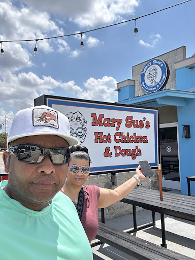 Today we happened to luck up on an experience of a lifetime. We stumbled upon this unexpected diamond in the rough as we were getting our tires rotated at Discount Tire in order to continue our excursion to Colorado. We entered and were immediately greeted by Kevin who was very customer service oriented and extremely hospitable. We felt like we were the strangers “invited to a family cookout” and became part of the Family. He allowed us to try their Macaroni and cheese, chicken tender bites, and personalized pickles. They were so very delicious that they tickled the taste buds. The Mac and cheese was creamy and seasoned, the pickles were drizzled in a delectable jalapeno honey base with spices, the chicken tenders were juicy and flavorful. I would have ordered everything that we tasted but we literally just had lunch at another restaurant prior to entering . However, we did have space for some dessert so we ordered Dough babies and cinnamon rolls. OMG!!! the DOUGH BABIES were melt in your mouth better than Krispy Kreme originals with the “HOT” light on!!! The cinnamon rolls were better than Cinnabon bakery company. This place is OUTSTANDING and that wasn’t even the best part of the experience. The owner (Mr. Eddie Deen) happened to be visiting so I took the opportunity to ask him “What is the concept behind Mary Sue’s?” I was expecting him to say something like this was my mothers dream or my wife’s dream to put that soulful feeling back into all of the dishes that we hold near and dear to our hearts. Oh boy…Was I wrong. We (Kevin, Eddie, my wife and I) ended up having a 30 minute dialogue about their concept of “WHO ARE YOU BECOMING”!! It turns out that the concept of Mary Sue’s is one of helping everyone define their customer which in turn helps their vision ultimately identifying their purpose. I was BLOWN AWAY. Kevin also talked about the essence of the soul and the spiritual connection through repetition and cognitive remembrance. This was fascinating to me and very refreshing. The mission and vision of this establishment is so inspiring. Do yourself a favor and visit this place. Indulge in some fantastic food and you can also learn that….
