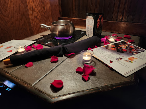 My husband and I, 75 years of age, chose "Thursdate" for our anniversary dinner. We were seated at a tiny corner table with three candles and rose petals, but told that the restaurant had NO HEAT! We wondered why it was open at all and I lamented the fact that I had not worn my fur-lined boots: my feet were freezing. Nighttime temperatures have been in the mid-teens; daytime temperatures in the low 20s; however, we had been cooking so much at home that we thought it would be nice to have someone else cook for us, for a change. After a first course of cheese fondue with mostly small rounds of bread, to which four small pieces of carrot and celery and two each of broccoli and cauliflower and some cut green apple were included, we considered taking our leave: It was really cold. But we decided to stick it out. Our waitress, Brittany, should have at least been supplied a sweater or jacket. She did her best, though her training should include offering fresh ground pepper on our salads: She had the pepper grinder with her, but it was difficult to get her attention, being tucked back in a far corner. When Brittany brought ice water, we asked for water that was not cold; it was cold enough, inside and out! She returned water with no ice, but it was still very cold, and we moved it as close as we could to the cook top. The chill didn't leave for a long time. Management might consider offering a hot, non-alcoholic, non-caffeinated drink for cold winter nights—especially if they open the restaurant without heat! My martini was good, but it was some time in arriving, even though we were the only patrons in the restaurant when we arrived. I did request Absolute vodka, as I'd never heard of their bar vodka. Unfortunately, there is no non-alcoholic beer available, which would have been my husband’s choice. The main course followed our salads--Caesar and spinach, and they were good enough and sufficient, given the amount of food that is included in the four-course meals. One serving plate included broccoli, potatoes, and two pieces of zucchini; the other, the meats. I attempted to carefully time everything, and there was a lot of it. A huge problem is that the cooktop was not within my reach without my having to stand up, reach over, add things to the broth, fish for the things that were done, and sit down each time. I had to do all of the cooking, as my husband has hardware in both legs and a shoulder replacement: Not a candidate for the calisthenics that I endured. My husband enjoyed the potatoes; we each enjoyed our single piece of zucchini; the broccoli became too salty, having spent too much time in the pot. The mushroom ravioli—one each—was tasty, and we enjoyed the shrimp and salmon; however, we didn’t get a lot of flavor from the chicken, the filet mignon, or the teriyaki-marinated steak. Fortunately, although we were stuffed, the dessert saved the day: fresh strawberry and banana slices, chocolate-covered marshmallows, blondies, brownies, rice crispies, and waffles pieces, all of which we dipped into our favorite: dark chocolate. We laughed a lot, because we always do, trying to find the humor in everything, and were glad for the diversion. During the night, I had a horrible reaction in my right sinus from the extreme cold and I was unable to sleep more than a couple of hours. The following day, I developed significant muscle pain in my buttocks from all the standing, leaning, cooking, scooping…and last night—two nights later—unbearable pain from my sciatic nerve continues as of this writing. In conclusion, I would suggest that management CLOSE THE RESTAURANT if there is no heat in sub-freezing temperatures; that the small, awkward, corner tables not be used, as it is not possible to reach the cook pot without more athletic ability than I have; that some consideration be given for older people so they do not have to do said gymnastics, and that beverage choices for non-alcohol drinkers and for winter be considered.