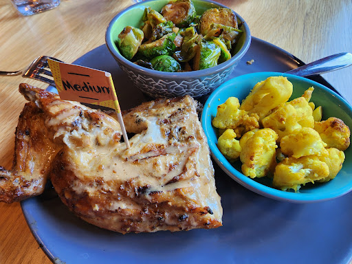 Read moreGrab a number that corresponds to the table you'll be sitting at and then order at the counter. When the food is ready, the staff will bring it out to you. The food was pretty good. I enjoyed the chicken thigh skewers more than the chicken bowl. The Macho Peas side had too much mint in it for my liking. The Garlic Bread side was very good. If you don't like the sauce you chose with your meal, there's a variety by the beverage machine to choose from. Average entree meal was between $9 - $14. The food came out within fifteen minutes. I went during lunch time and the place was half full. There was a minute or two wait to order from the counter. There's also a small outdoor seating area that has a view of the busy intersection and construction right across the road. The place is pretty clean, although my flip flops did stick to the floor a little bit but it wasn't very noticeable. There was also a small sink wash station by the beverage machine. The staff were all friendly and polite. The ambience of the place was...