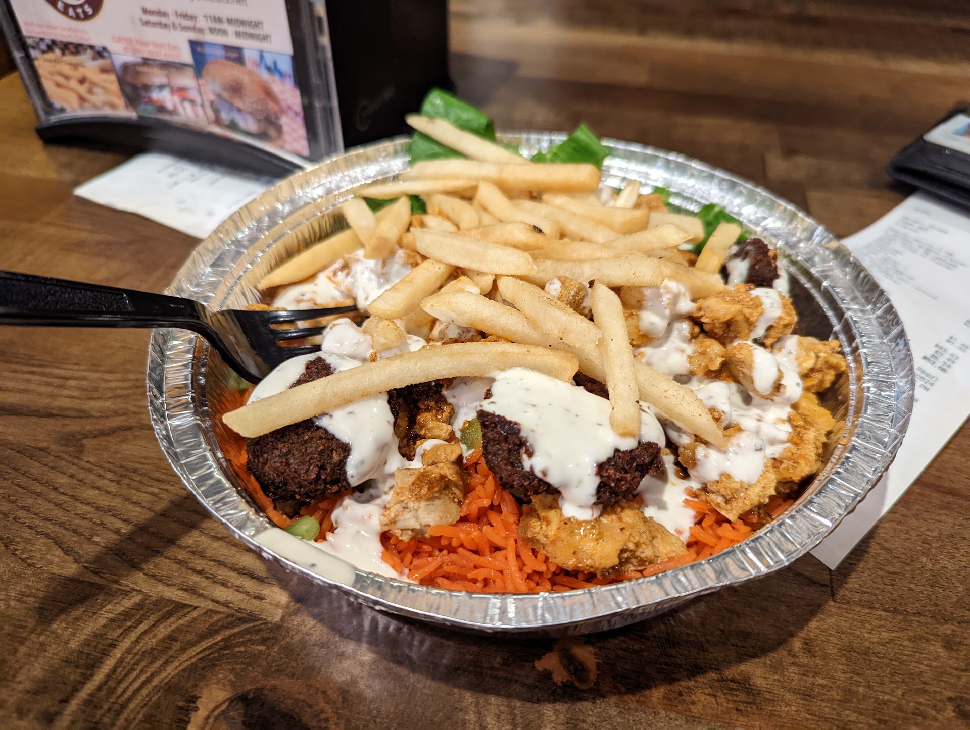 The food was honestly not great. I think the veggies were fresh and that's about all I can say. The meat was dry and bland except for heat (like heat was the only thing you could taste with no flavor from spices or even a flavor from whatever they used to make it hot), and the white sauce they advertise so heavily wasn't anything to write home about. Maybe it was a bad batch but I'm not inclined to try again and find out. I've had better food from similar fast food in the area.