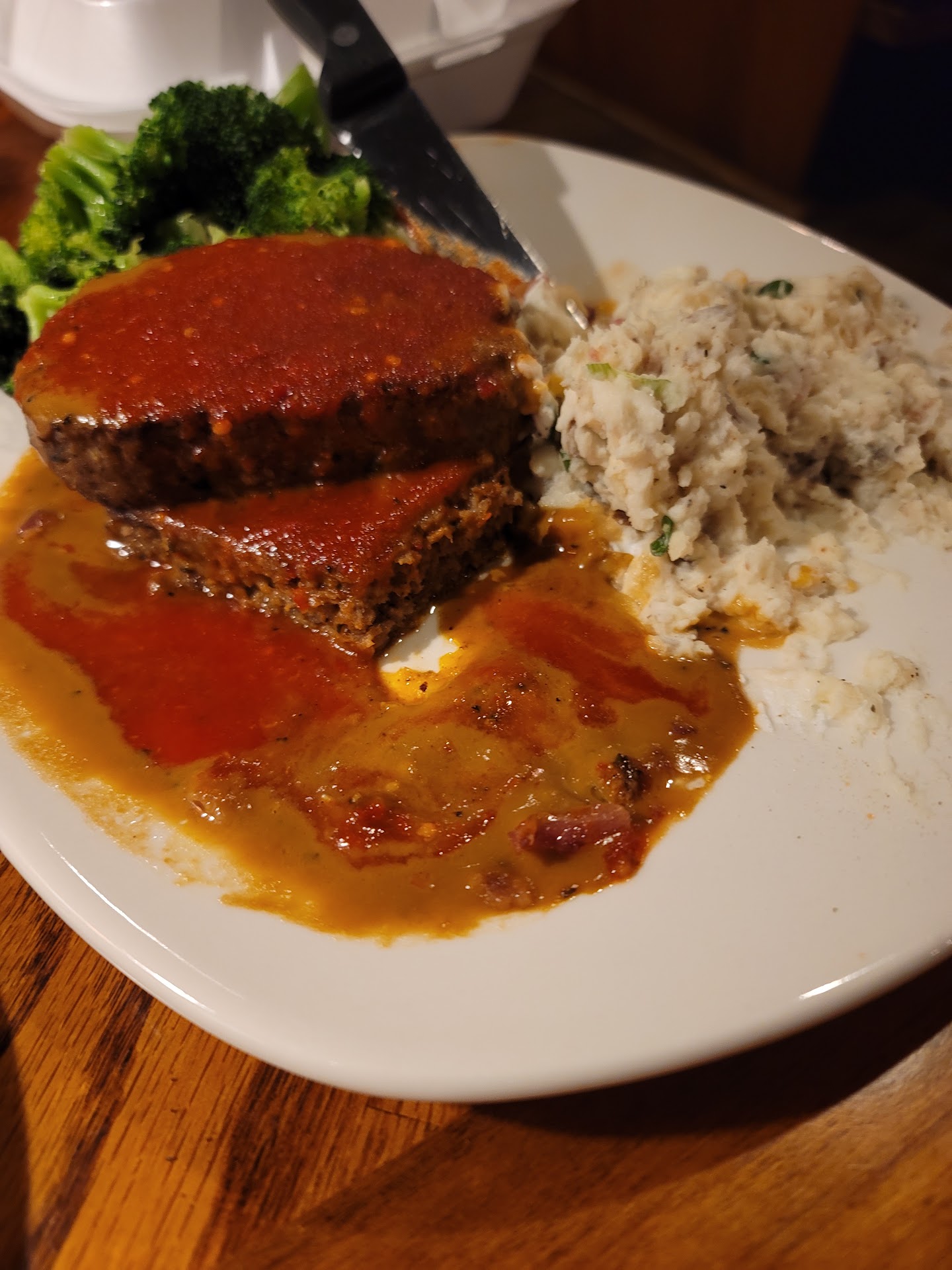 By the time everything was said and done, my meatloaf was cold. So I only ate half of my rice and the freshly made loaded mashed potatoes they brought out. I was just done with it all. Paying $20 for a meal... you should not have a single cold item on your plate. They brought my daughter's boyfriend's plate out late, and he still had cold food. So, I'm not sure what the excuse could be.