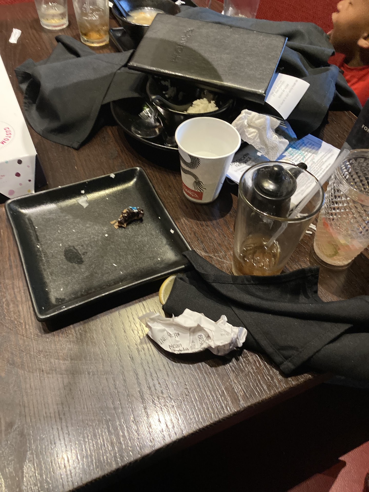 It was really upsetting, I wanted to just take the dishes and move them to another table, but I didn’t like how that would look and I was afraid of embarrassing my family. I was a very upset and wanted to speak out, but I felt that I would not say it in the best way. If you need pictures, please send me an email and I will show you how ridiculous this table looks for people celebrating and trying to have a good time. I felt that the waitress had no respect for her job or the customers that she...