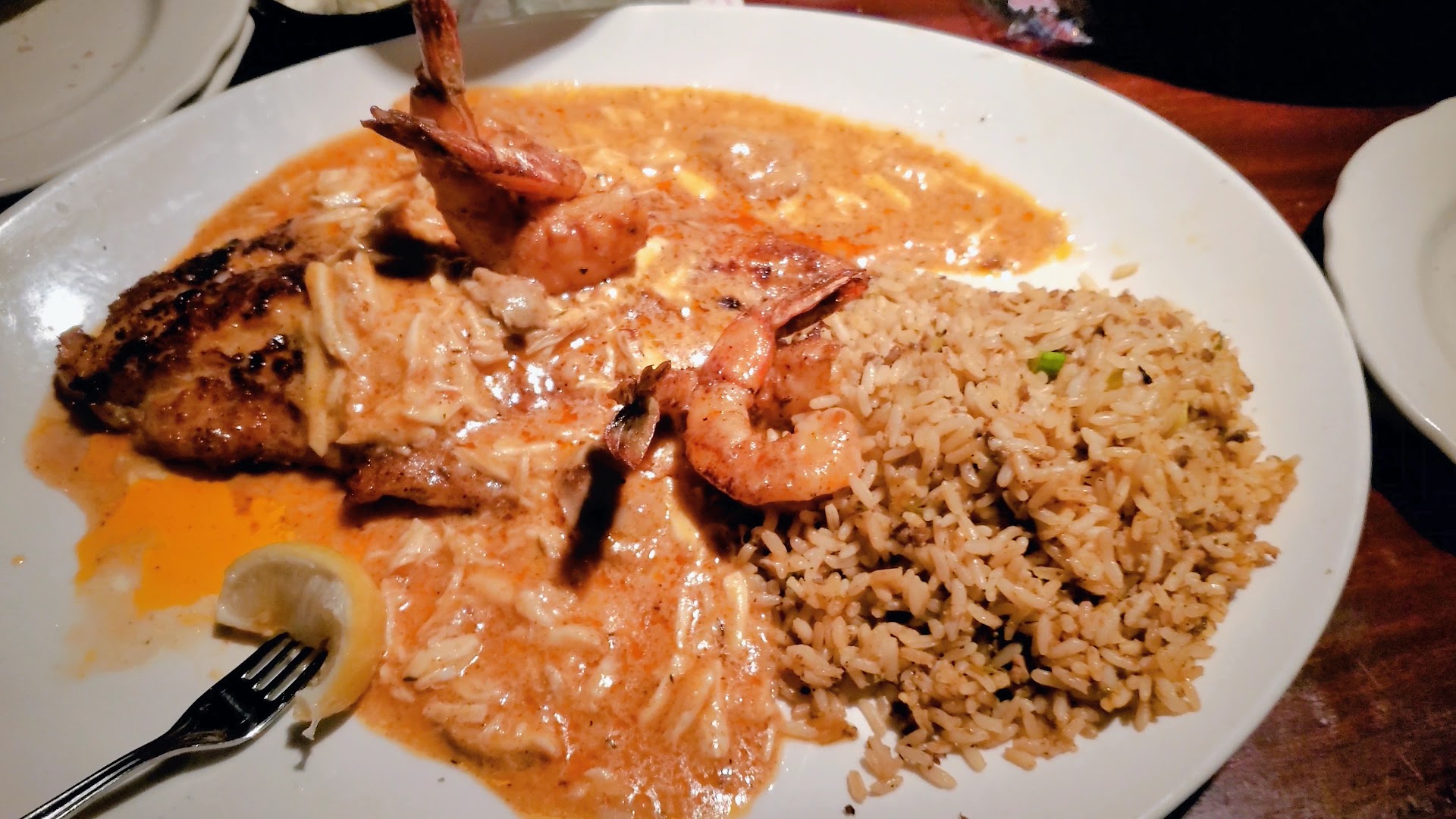 I ordered the Mississippi Catfish Opelousas, a dish that contains a blackened catfish, which was cooked perfectly, however the texture of the fish was ruined, because it was served in an an absolutely excessive amount of the lemon garlic butter sauce, a sauce that I assumed would be on the lighter side, but due to the sheer quantity of sauce, it didn't turn out as light as it was described. The sauce didn't just ruin the texture of the fish, it also completely overpowered the texture and flavor of the lump crab and oysters that my dish also came with. Had I known that the large amount of sauce would compromise the majority of the dish, I would have ordered the sauce on the side from the start. Also, though the sauce tasted slightly too salty, it was nothing compared to how overly salted the dirty rice was; I took one bite of the salty dirty rice and I just couldn't bring myself to take another bite from there. In conclusion, the Mississippi Catfish Opelousas, a $40 entrée, was overpriced for its poor execution, especially with how excessively salty the dirty rice was, and how the heavier-than-expected over applied sauce ruined the texture and flavor of all the proteins.