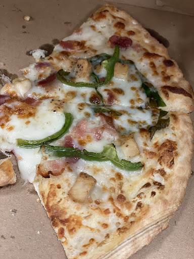So I forgot to take a whole photo as i tried Pie Five for the first time on the go late to my class, so this is almost devoured pizza (It was good). The pizza toppings were not as diverse as i initially thought Pie Five was going to have (they had onions but not grilled, or like, no crazy options like shrimp and pesto sauce) there are traditional toppings but for what was offered, they were savory. I got the flatbread and it was not bad, had that bland bread taste that just wasn’t memorable, but that’s from the bread standpoint. The toppings and sauce were what made me like it and I want to go back. It didn’t take long to get my food, and they are very organized and clean in the restaurant. You can get up to, I think five toppings before is an extra Dollar or so extra per topping. This pizza in the picture is flatbread, Alfredo sauce, cheese (they asked me if i wanted cheese, i didn’t know i could specify until after mine was in the oven lol), chicken, bacon, and green peppers. I’m not sure if it’s like chipotle and they make the ingredients like the chicken and bacon in the restaurant but I can’t wait to learn more about it. Good customer service, You might need to ask them to explain more if you want a more specific experience.