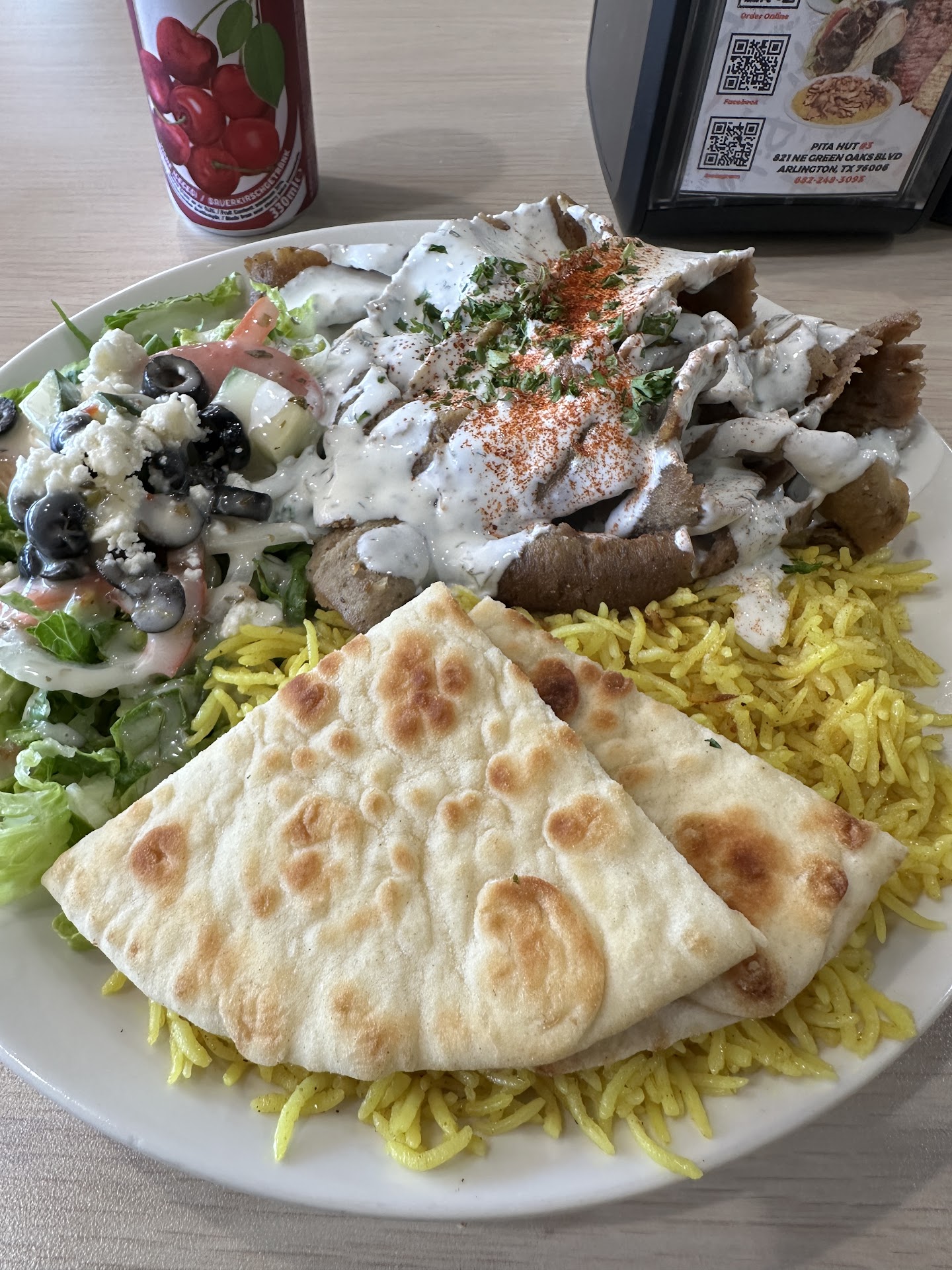 I ordered the gyro platter, and from the first bite, it was clear why locals rave about this place. The meat was tender and perfectly seasoned, balanced by fluffy rice and the freshest vegetables I’ve had in a quick-serve restaurant. The tzatziki sauce was bright and tangy, not overpowering but crafted to lift every bite. Even the pita bread — soft, warm, and slightly charred — tasted like it came straight from a family kitchen rather than a chain.